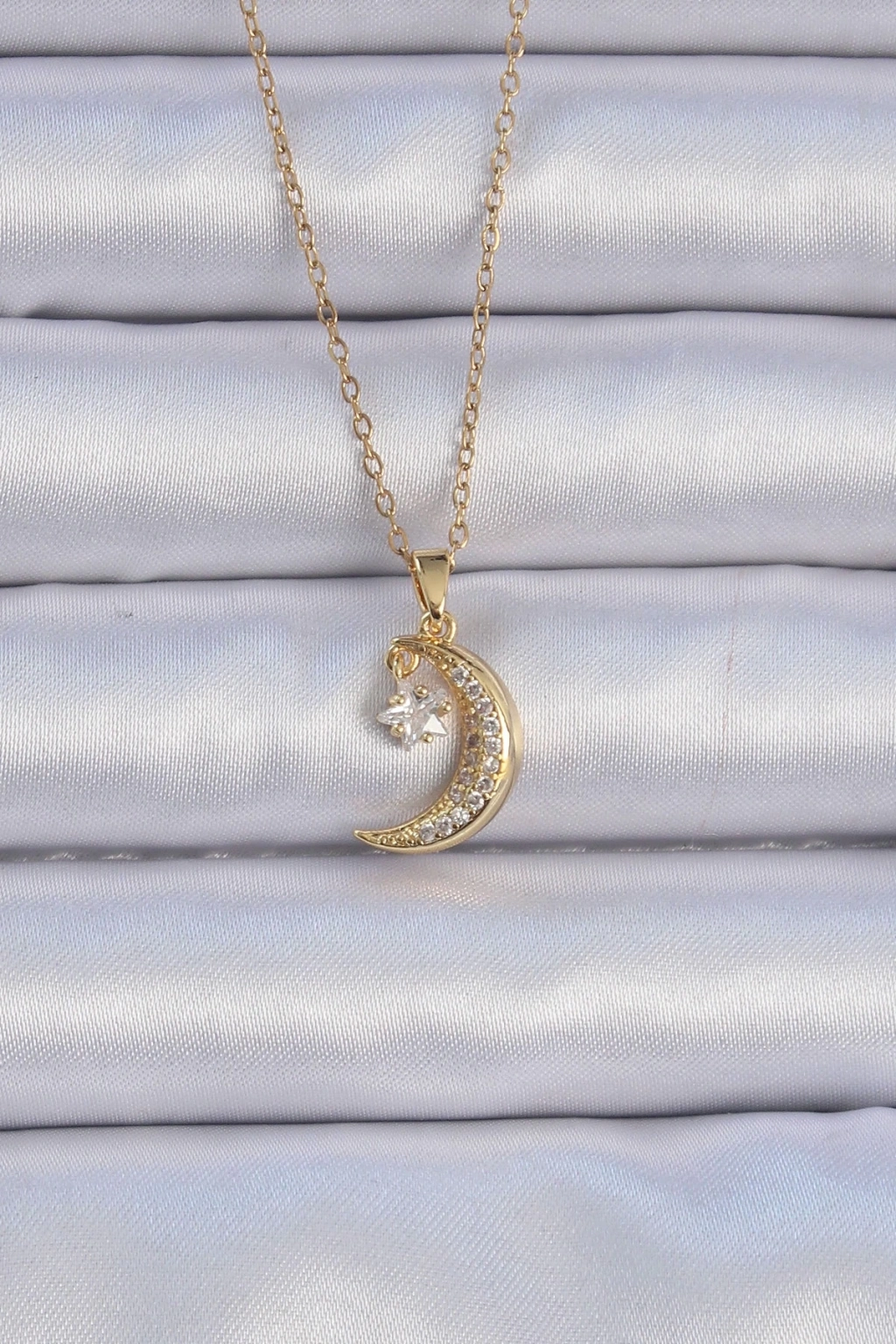 ® 316L Çelik Zincir Altın Renk Zirkon Taşlı Sallantılı Ay Yıldız Kolye
