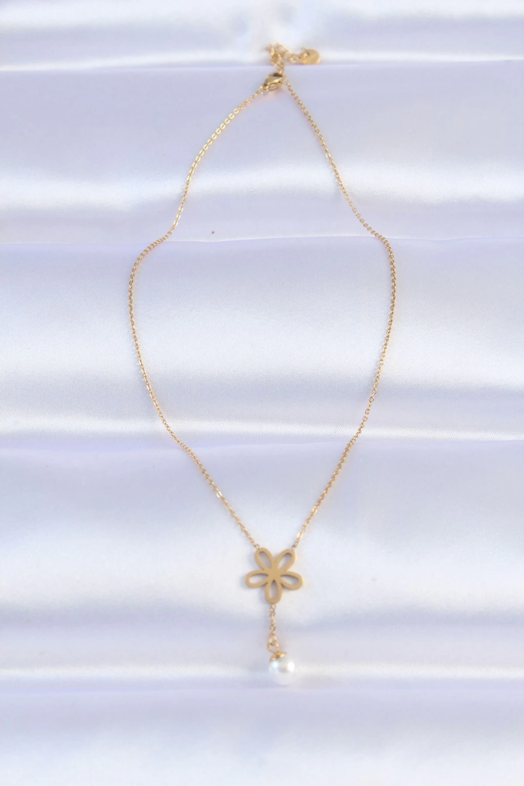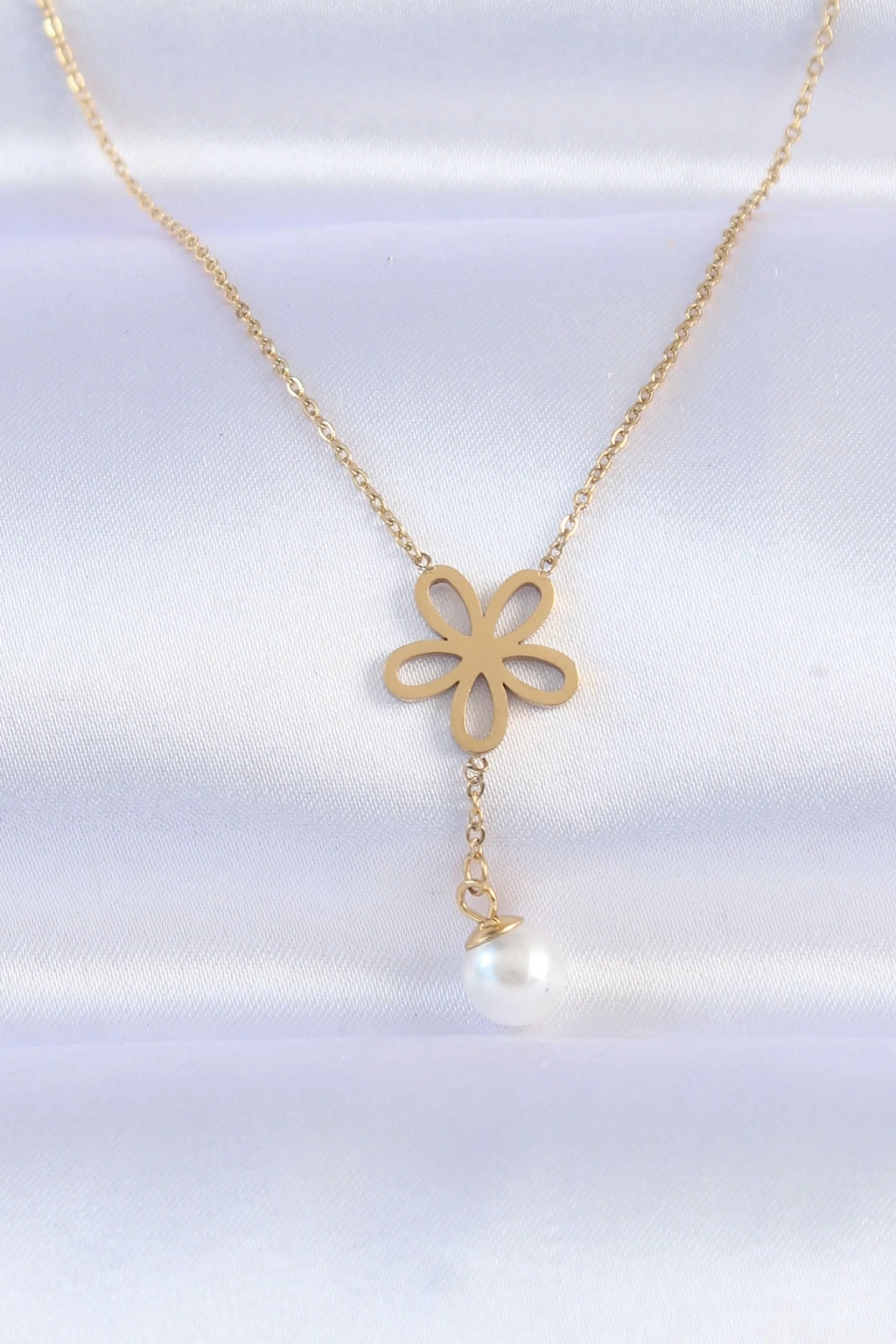 ® 316L Çelik Zincir Gold Renk İnci Detay Çiçek Kolye