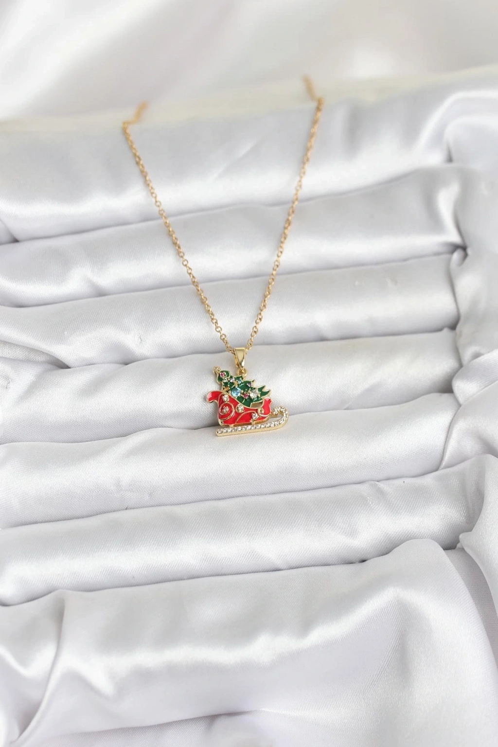® 316L Çelik Zincir Gold Renk Kızak ve Çam Ağacı Figürlü Yılbaşı Temalı Kadın Kolye