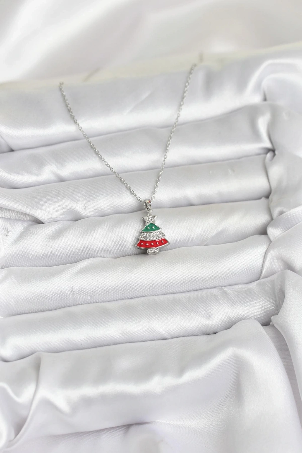 ® 316L Çelik Zincir Gümüş Ren Çam Ağacı Model Zirkon Taşlı Yılbaşı Temalı Kadın Kolye