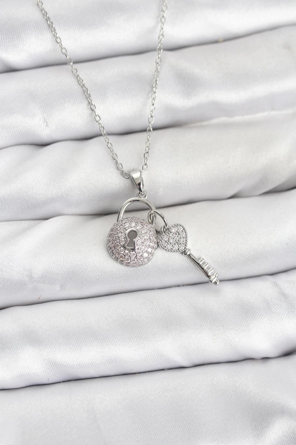 ® 316L Çelik Zincir Gümüş Renk Kilit Anahtar Model Zirkon Taşlı Kadın Kolye