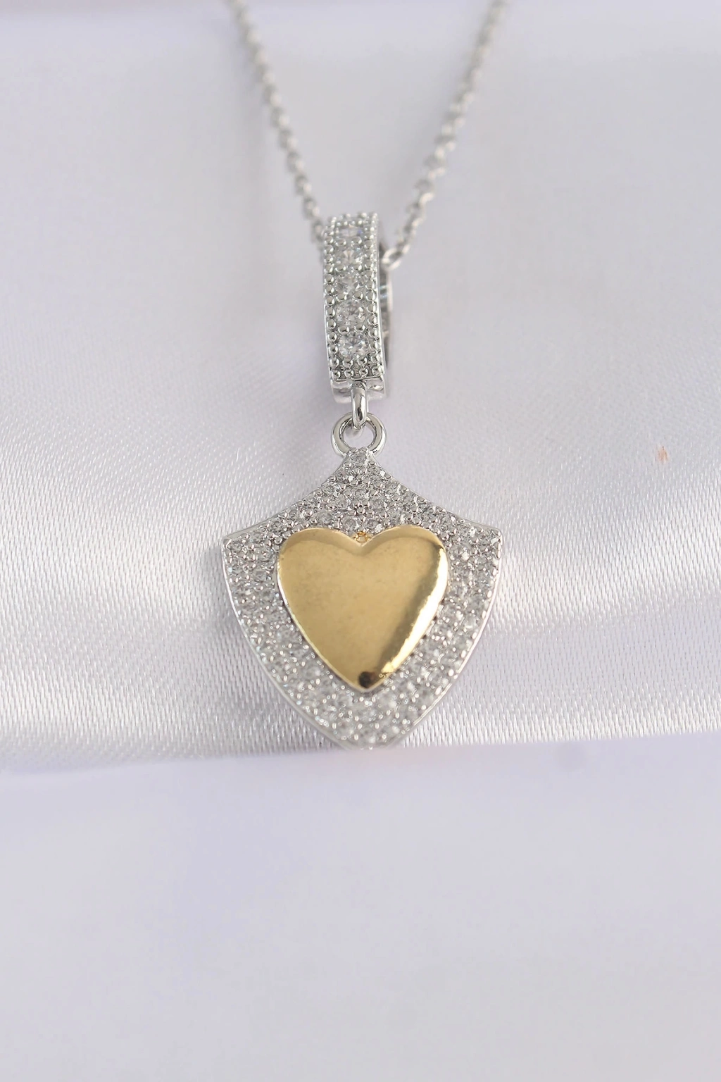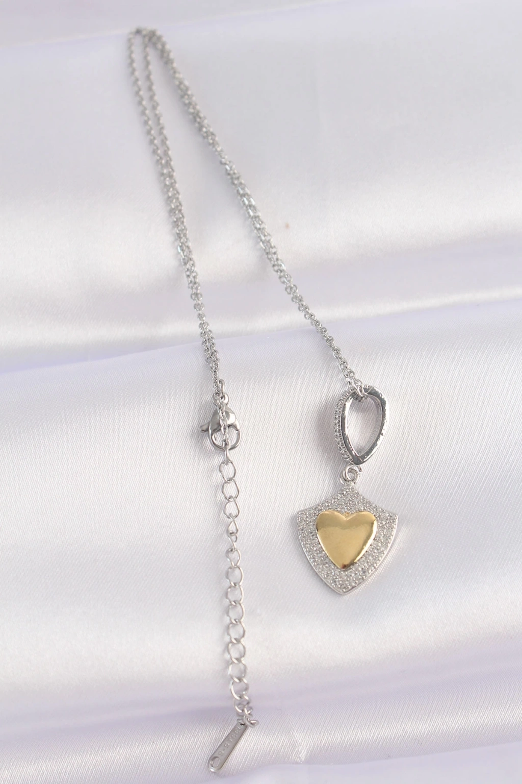 ® 316L Çelik Zincir Gümüş Renk Zirkon Taşlı Tasarım Altın Renk Kalp Kolye