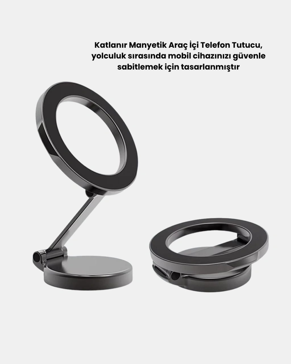 Sürüş esnasında telefonunuzu güvenle sabitlemenin en pratik yolu: Katlanır Manyetik Araç Telefon Tutucu. Güçlü manyetik çekim gücü sayesinde telefonunuzu sarsıntısız bir şekilde sabit tutar. MagSafe destekli cihazlar için özel olarak tasarlanmış manyetik yüzeyiyle maksimum uyum sağlar.360° dönebilir ve ayarlanabilir tasarımı, ekranı istediğiniz yöne çevirebilmenize olanak tanır. Dikey veya yatay kullanım seçenekleriyle navigasyon, müzik veya arama işlemlerinizi kolaylaştırır.Katlanabilir yapısı sayesinde kullanmadığınız zamanlarda tamamen kapanarak yer tasarrufu sağlar. Estetik ve minimalist tasarımı, araç iç mekânına modern bir dokunuş katar.Dayanıklı malzeme yapısı, uzun ömürlü kullanım sağlarken, güçlü yapışkan tabanı sayesinde pürüzsüz yüzeylere sıkıca tutunur. Ergonomik formu sayesinde görüş açınızı engellemeden konforlu bir sürüş sunar.Katlanır Manyetik Araç Telefon Tutucu, pratikliği, şıklığı ve güvenliği bir araya getirerek sürüş deneyiminizi ileri taşır. Her yolculukta telefonunuz sabit, sürüşünüz konforlu olsun!