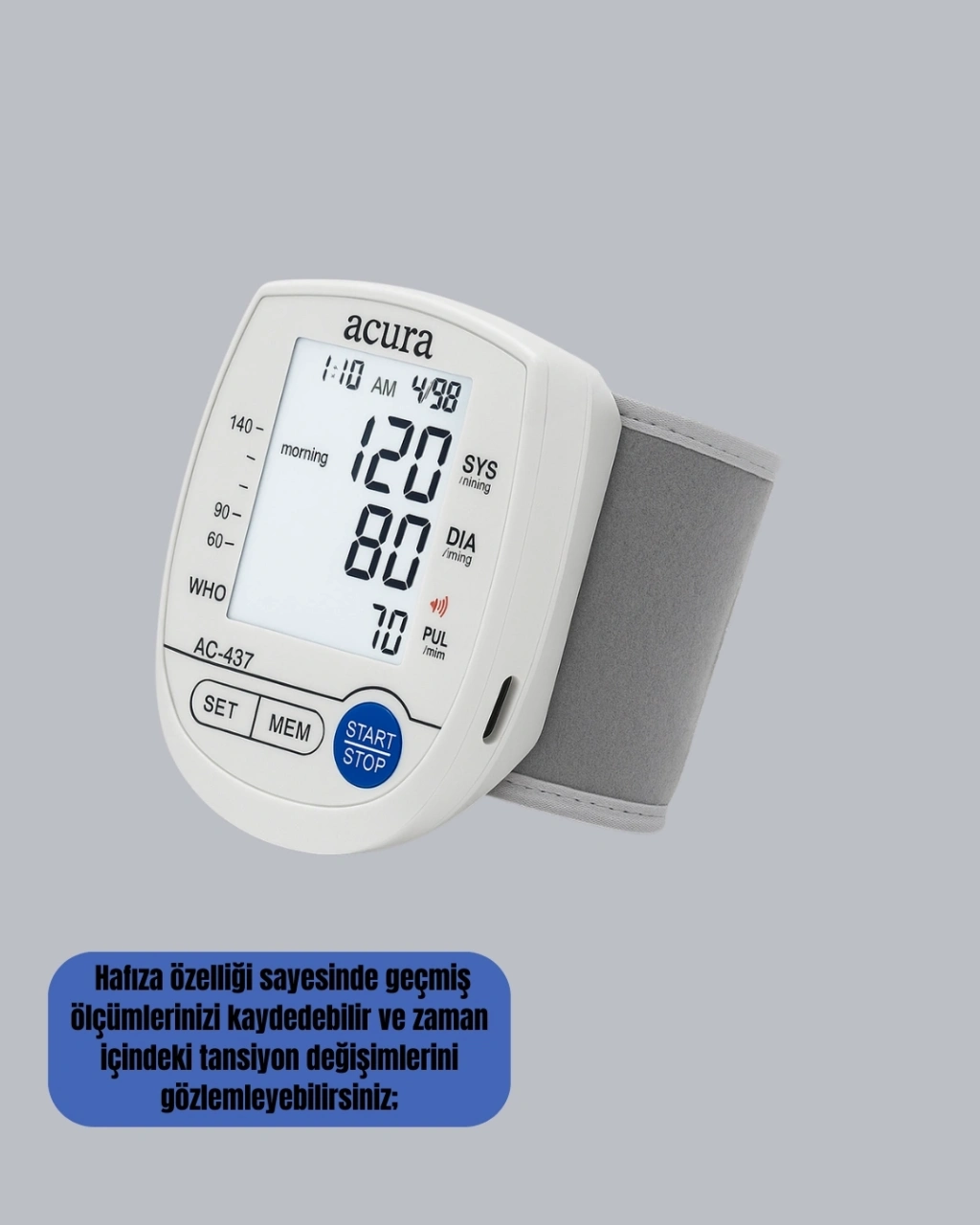 Hem pilli hem şarjlı kullanım sunan bu dijital bilek tansiyon aleti, pratik ve güvenilir ölçüm yapabilmeniz için son teknoloji ile donatılmıştır. Bileğe kolayca yerleştirilen cihaz tek tuşla ölçümü başlatır ve saniyeler içinde tansiyon sonuçlarını ekranda gösterir. Büyük dijital ekran, özellikle yaşlı kullanıcılar için büyük bir avantaj sağlar. Hafıza özelliği, ölçümlerinizi kaydederek tansiyon değişimlerinizi düzenli olarak takip etmenize yardımcı olur. Bu sayede sağlık kontrolünüz daha düzenli hâle gelir. Pilli kullanım, dış mekânda özgürlük sağlarken, şarjlı kullanım ekonomik ve uzun ömürlüdür. Hafif ve ergonomik yapısı ile her ortamda rahatlıkla kullanılabilir. Kompakt tasarımı sayesinde çantanızda kolayca taşıyabilirsiniz. Hem günlük kullanımda hem de acil durumlarda tansiyon takibini hızla yapmanızı sağlar.