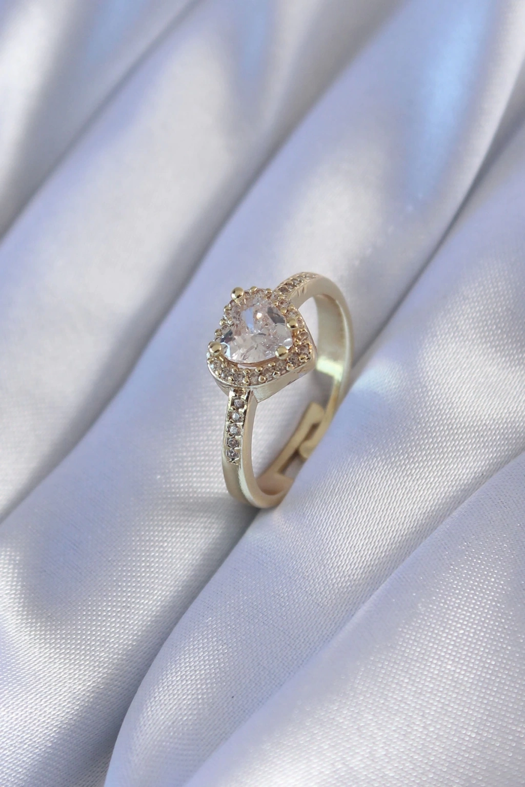® Gold Renk Zirkon Taşlı Kalp Model Pirinç Charm Kadın Yüzük