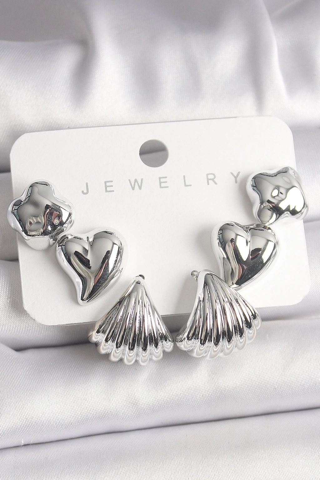 ® Gümüş Renk Yonca Kalp Deniz Kabuğu Figür CCB Kadın Küpe Seti