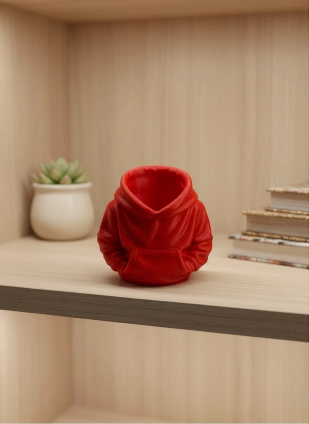 Kırmızı hoodie kalemlik, masa üstü düzenini sağlarken dekoratif bir görünüm sunan eğlenceli bir aksesuardır. 10x10 cm ölçüsü ile masa, raf veya kitaplık üzerinde rahatlıkla kullanılabilir. Hoodie şeklindeki tasarımı, ürünü sıradan kalemliklerden ayırarak özgün bir stil ortaya koyar.Canlı kırmızı tonu, bulunduğu alana enerji ve sıcaklık katar. Evde çalışma alanlarında, ofis masalarında veya öğrenci odalarında rahatlıkla tercih edilebilir. Kalem ve küçük ofis gereçlerini düzenli şekilde saklamaya yardımcı olurken masa üstünde şık bir detay oluşturur.Dekoratif yapısı sayesinde yalnızca işlevsel bir kalemlik değil, aynı zamanda masa düzenini tamamlayan bir obje olarak da kullanılabilir. Küçük boyutları sayesinde dar alanlarda bile yer kaplamaz.Dayanıklı yapısı ile günlük kullanıma uygundur. Masa üstüne renk katmak isteyenler ve farklı tasarımlara sahip masa aksesuarları arayanlar için ideal bir üründür. Hem kendiniz hem de sevdikleriniz için eğlenceli bir hediye alternatifi sunar.