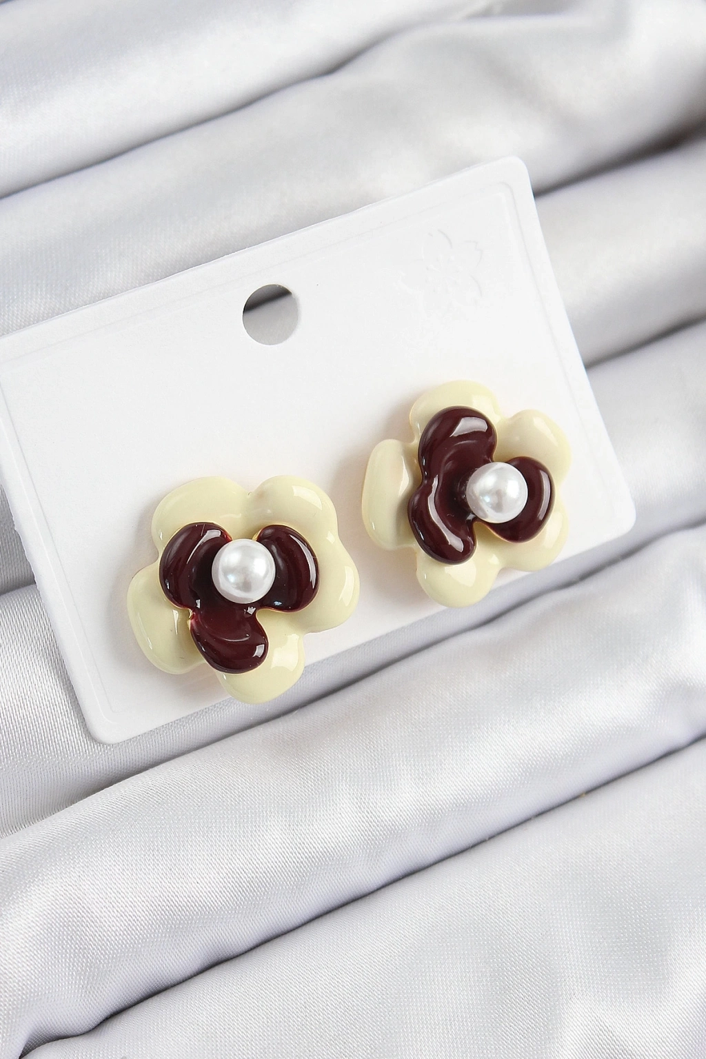 ® İnci Detaylı Krem Kahverengi Renk Papatya Model Kadın Küpe