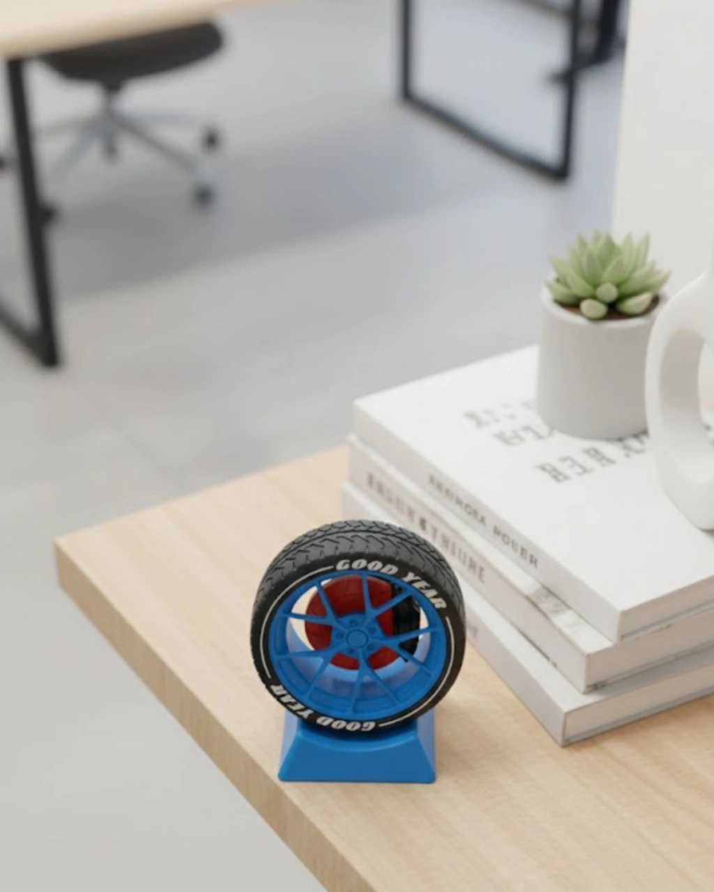 Modern ofis dekoru anlayışına uygun olarak tasarlanan bu jant görünümlü masa üstü aksesuar, sade çalışma alanlarına hareket kazandırır. Raf, masa veya sehpa üzerinde sergilenebilir. Ofis ortamında dekoratif obje olarak kullanıldığı gibi vitrin veya showroom alanlarında da şık bir tamamlayıcıdır. Minimal ve kompakt yapısı sayesinde her alana uyum sağlar. Spor ve modern tarzı bir araya getiren dekoratif bir üründür.