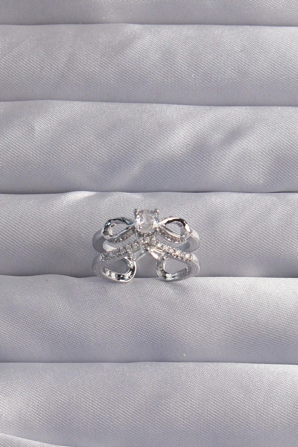 ® Pirinç Ayarlamalı Gümüş Renk Zirkon Taşlı 2li Görünüm Fiyonk Yüzük