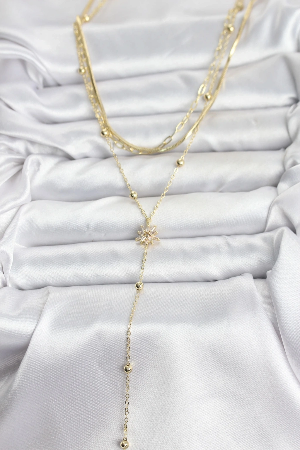 ® Pirinç Gold Renk Kutup Yıldızı Model Detaylı 3'lü Kombin Y Kadın Kolye