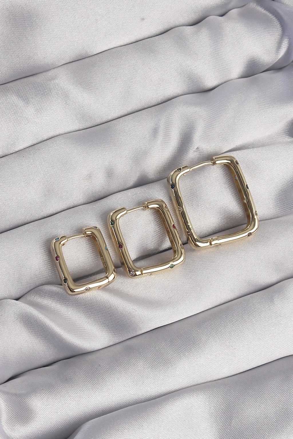 ® Pirinç Gold Renk Renkli Zirkon Taşlı Kare Model Küpe Seti