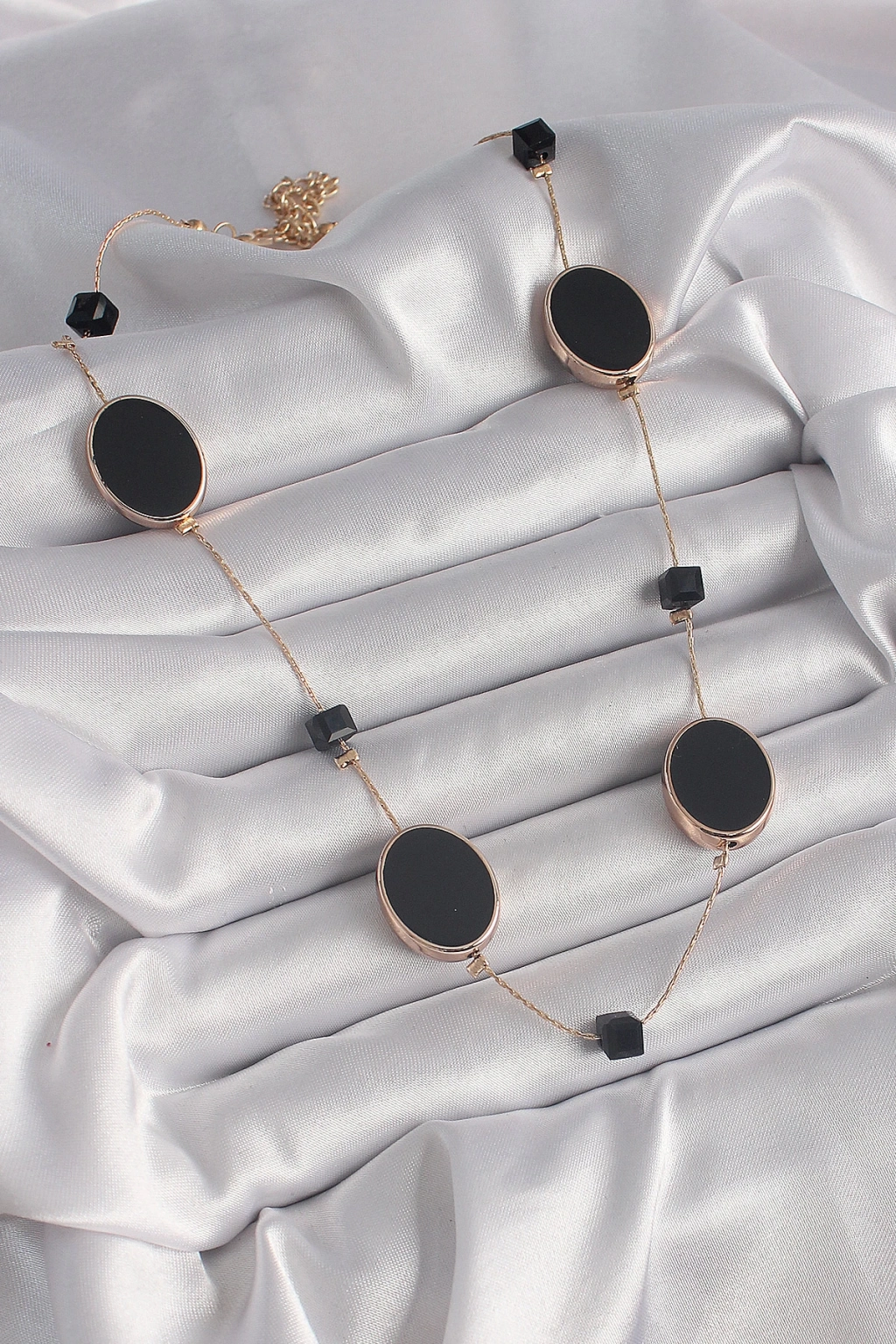 ® Pirinç Gold Renk Siyah Renk Oval Siyah Küp Detay Kadın Kolye