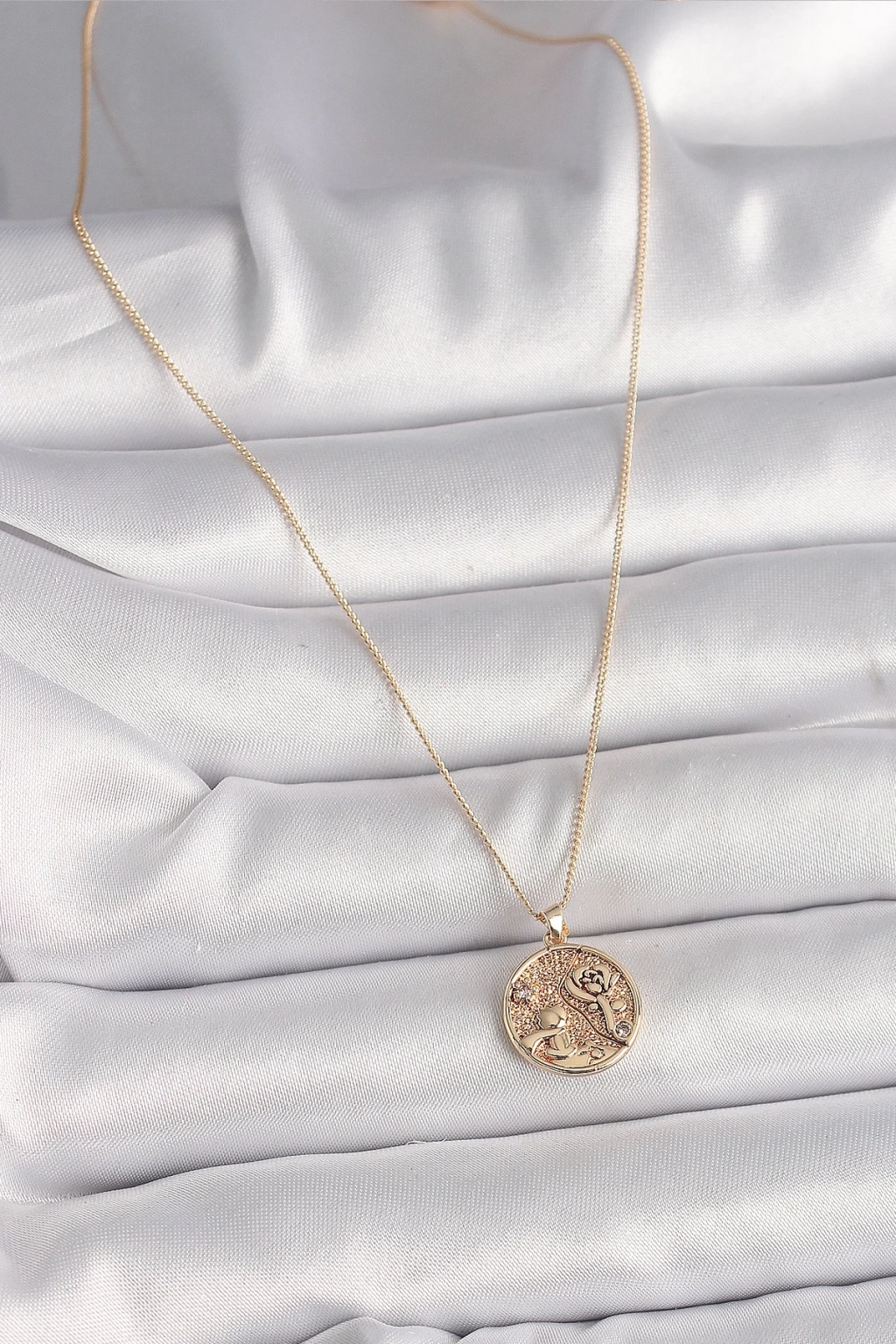 ® Pirinç Gold Renk Zirkon Taş Detaylı Gül İşleme Madalyon Model Kadın Kolye
