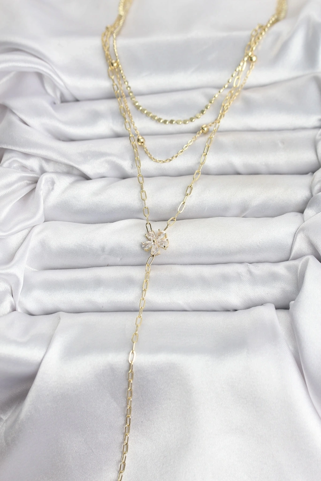® Pirinç Gold Renk Zirkon Taşlı Çiçek Model Detaylı 3'lü Kombin Y Kadın Kolye