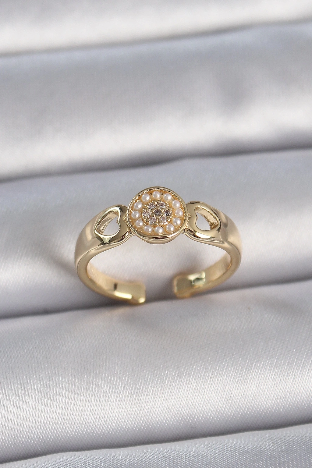 ® Pirinç Gold Renk Zirkon Taşlı İncili Kalp İşleme Detay Ayarlanabilir Kadın Yüzük