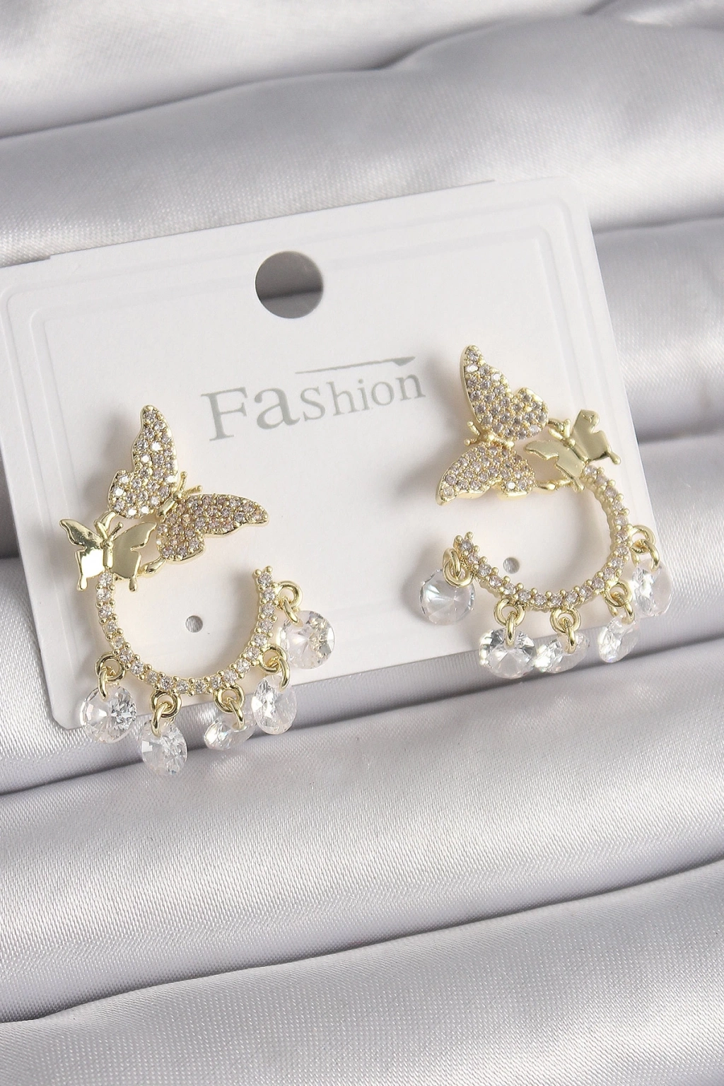 ® Pirinç Gold Renk Zirkon Taşlı Sallantı Detay Kelebek Model Kadın Küpe