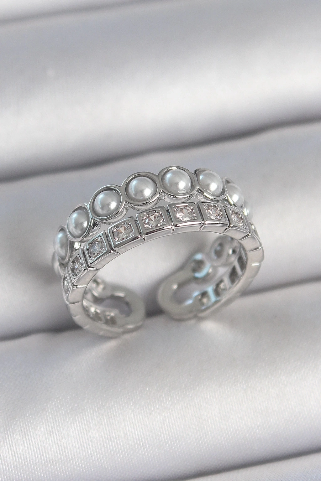 ® Pirinç Gümüş Renk 2'Li Sıra Zirkon Taşlı Ve İncili Ayarlanabilir Kadın Yüzük