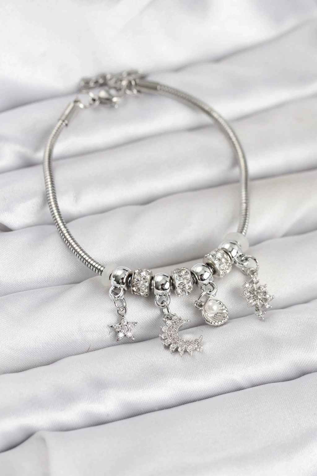 ® Pirinç Gümüş Renk Ay Charm Model Charmlı Kadın Bileklik
