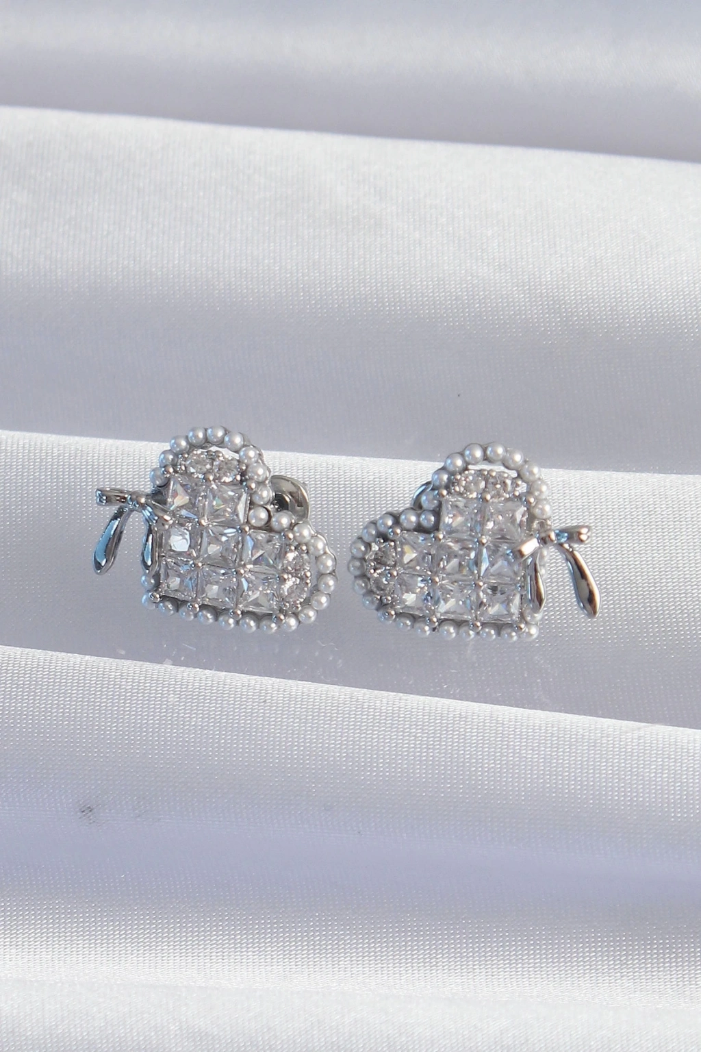 ® Pirinç Gümüş Renk Fiyonk Detay İncili Zirkon Taşlı Kalp Küpe