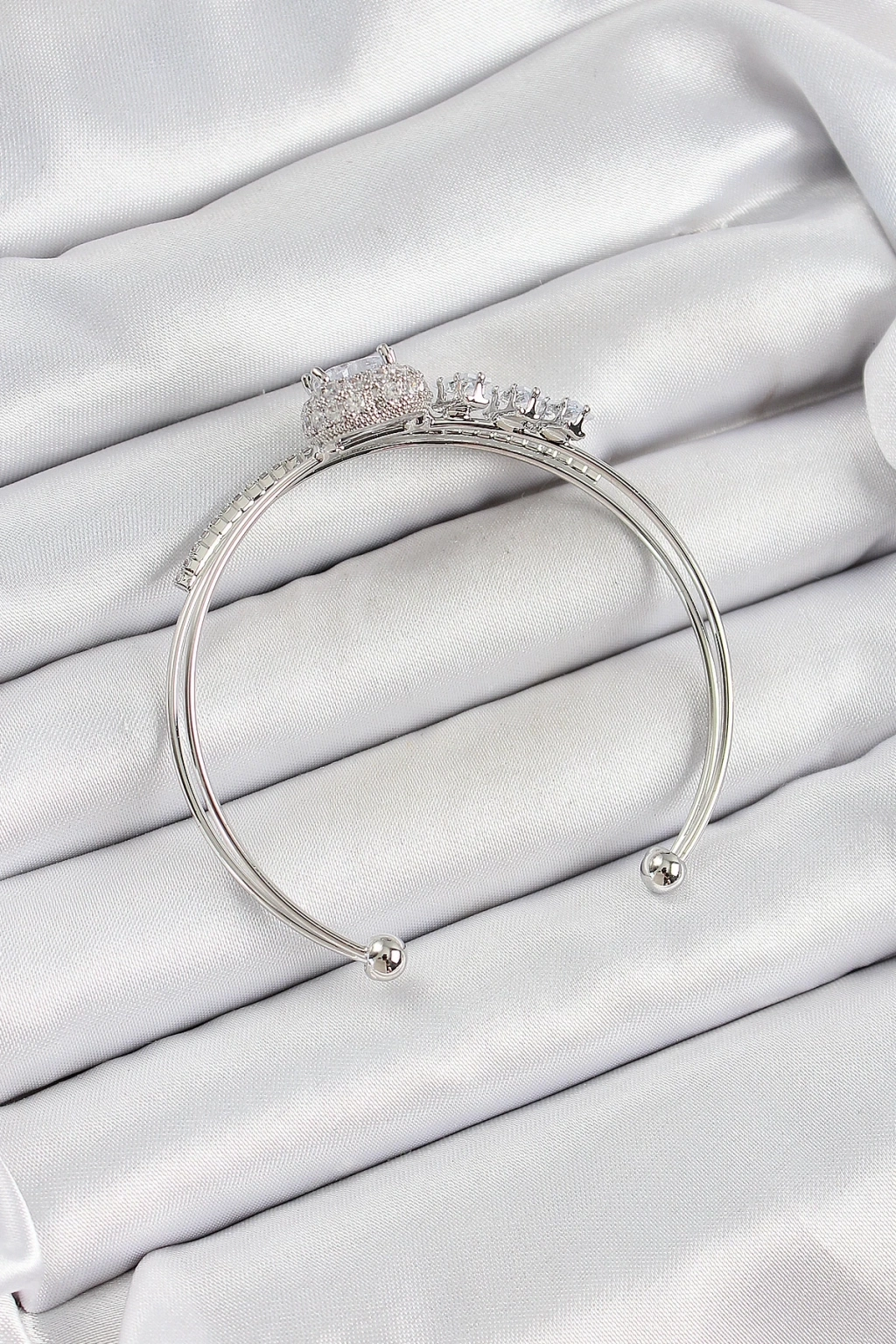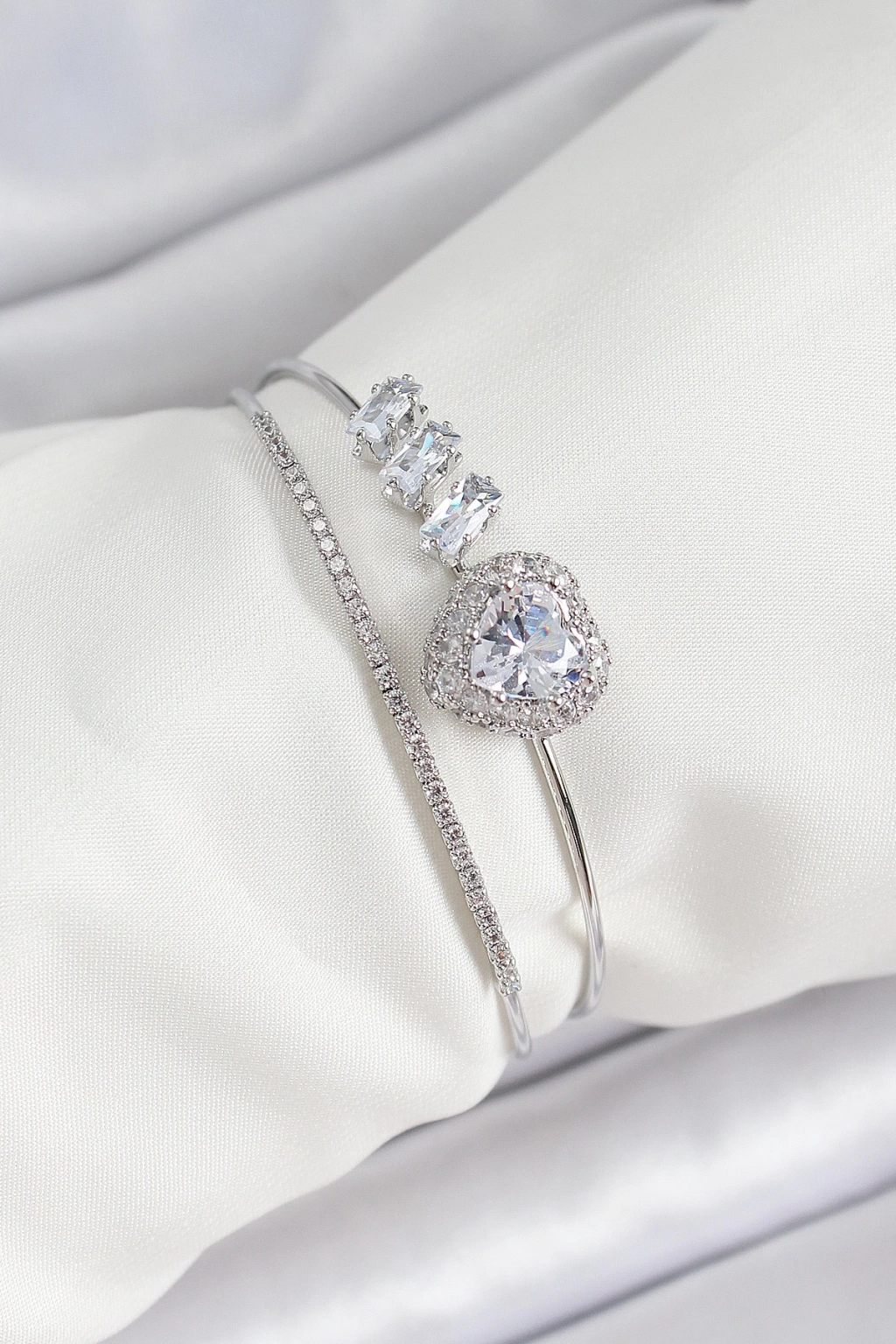 ® Pirinç Gümüş Renk Kalpli Zirkon Taşlı Kadın Bileklik