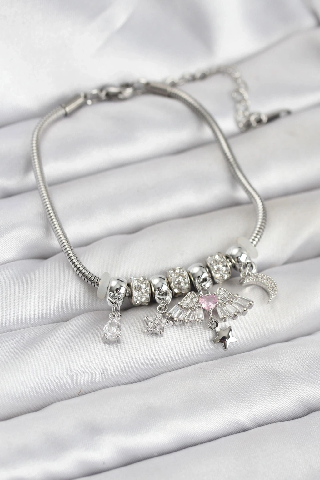 ® Pirinç Gümüş Renk Kanatlı Charmlı Kadın Bileklik