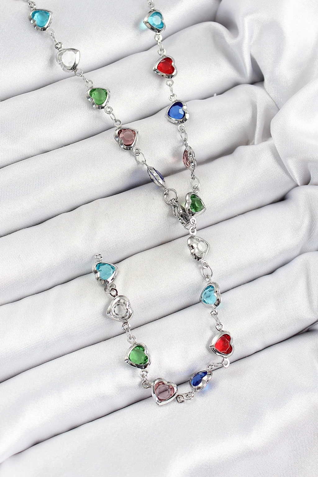 ® Pirinç Gümüş Renk Karışık Renk Zirkon Taşlı Kalpli Y Kadın Kolye