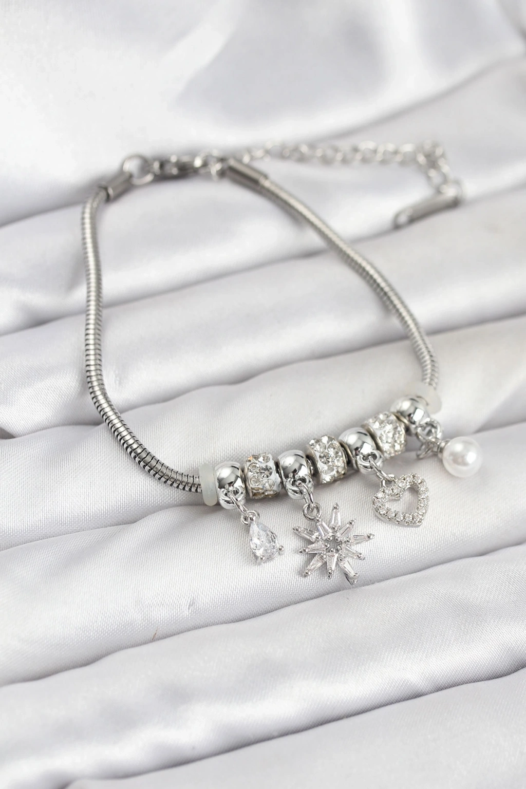 ® Pirinç Gümüş Renk Kutup Yıldızı ve Kalp Charmlı Kadın Bileklik