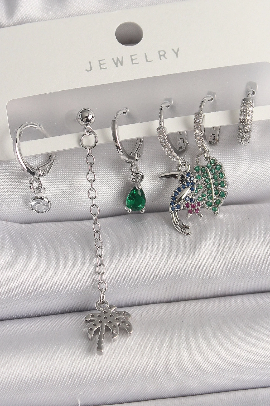 ® Pirinç Gümüş Renk Sallantı Zirkon Taşlı Ağaç Figür Çoklu Kadın Küpe Seti