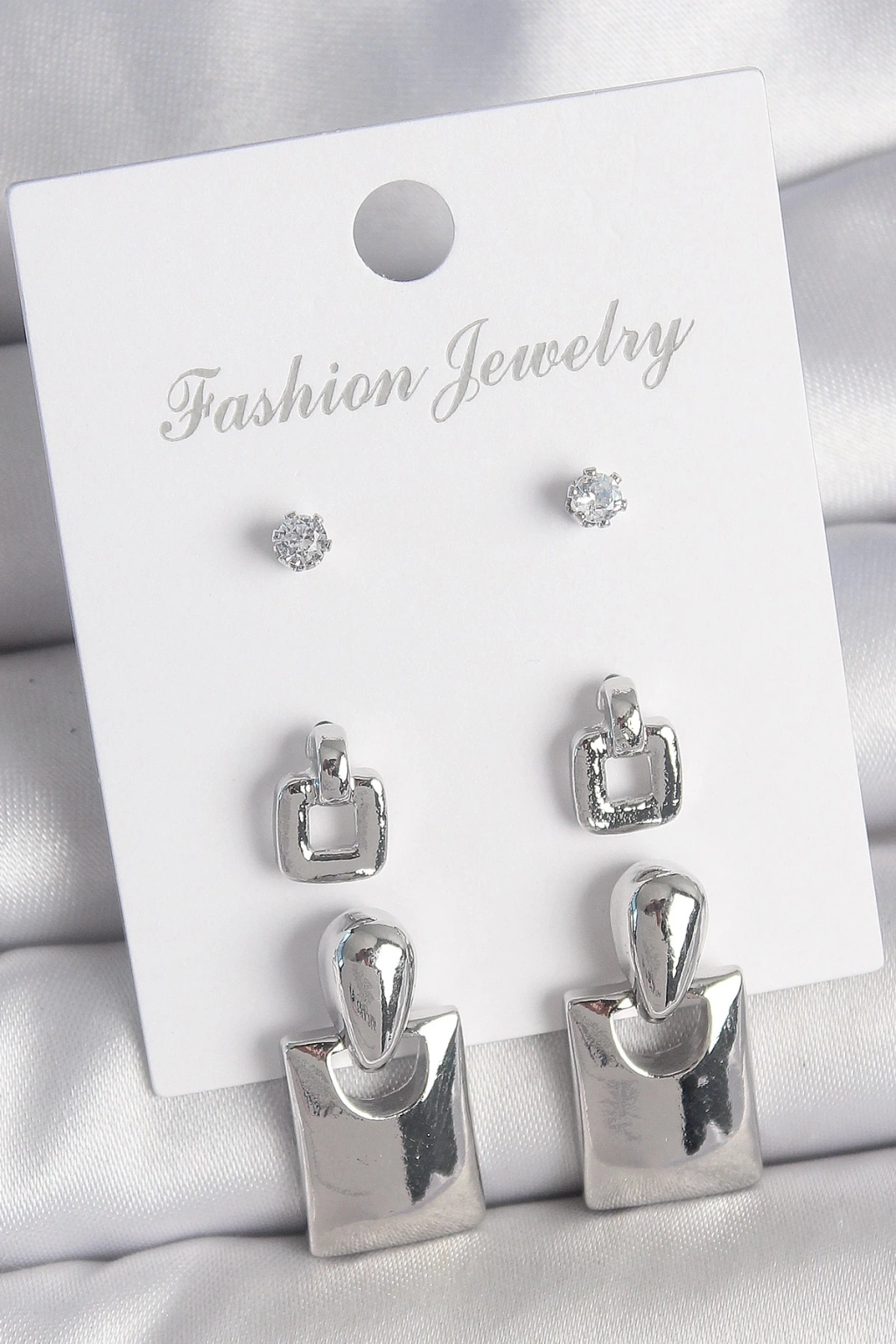 ® Pirinç Gümüş Renk Zirkon Taş Detay Sallantılı Kare Model 3 Çift Kadın Küpe Seti