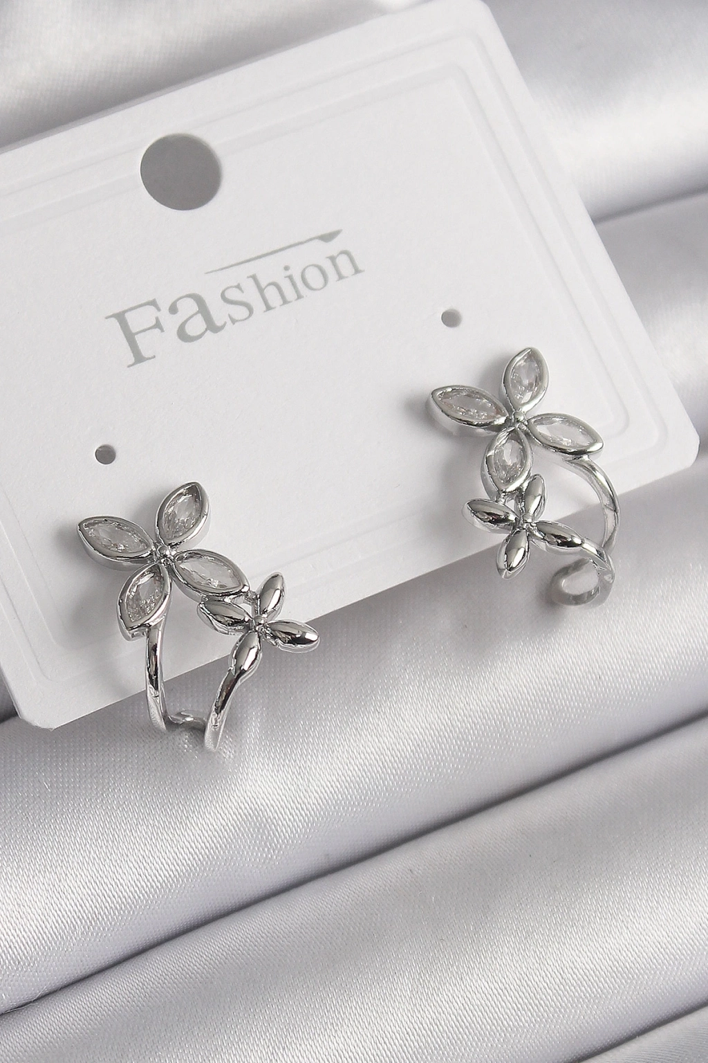 ® Pirinç Gümüş Renk Zirkon Taşlı 2'Li Çiçek Model Kadın Küpe
