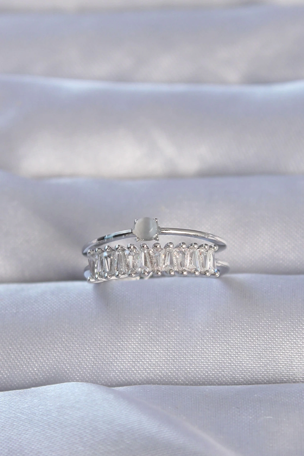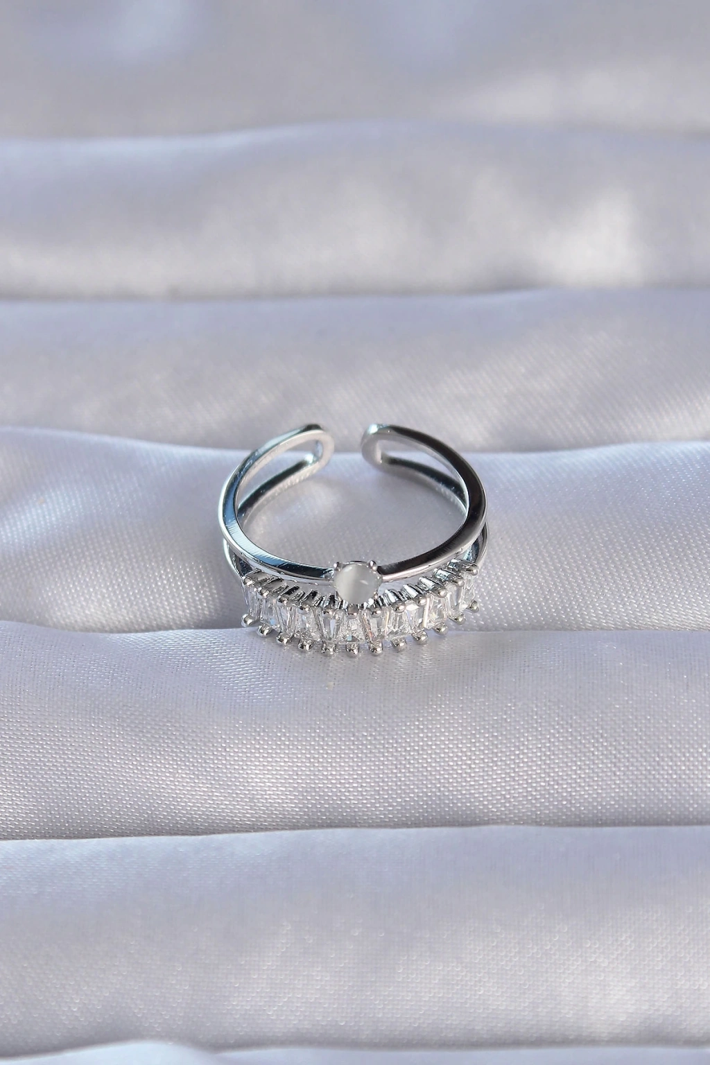 ® Pirinç Gümüş Renk Zirkon Taşlı Baget Su Yolu Model Ayarlanabilir Yüzük