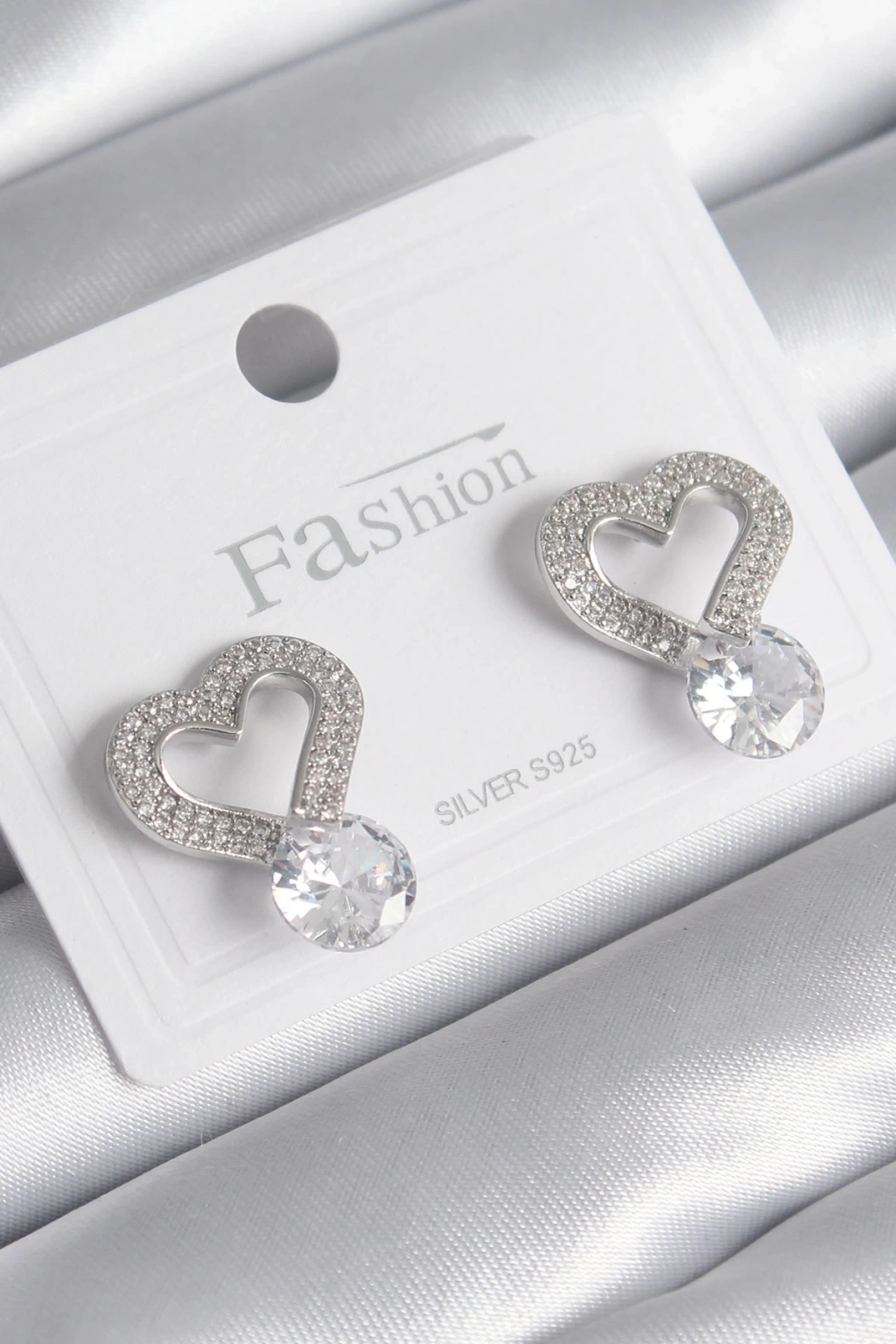 ® Pirinç Gümüş Renk Zirkon Taşlı Kalp Model Damla Zirkon Taş Detay Kadın Küpe