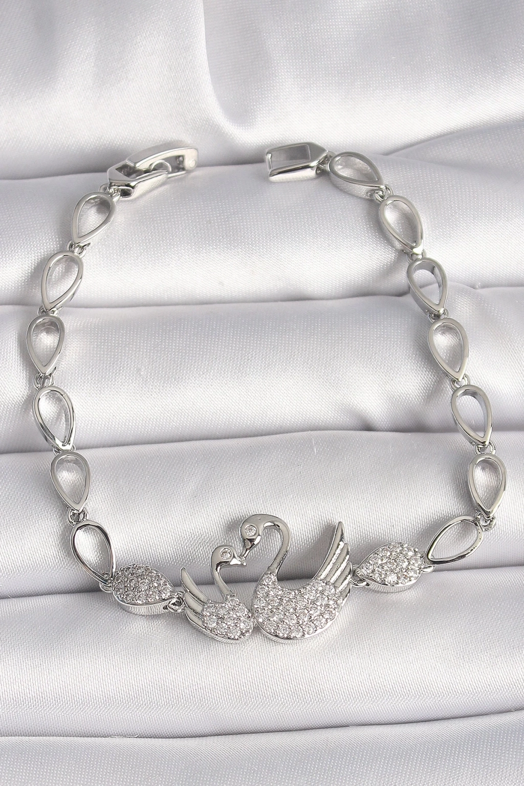 ® Pirinç Gümüş Renk Zirkon Taşlı Kuğu Figür Damla Zincir Model Kadın Bileklik