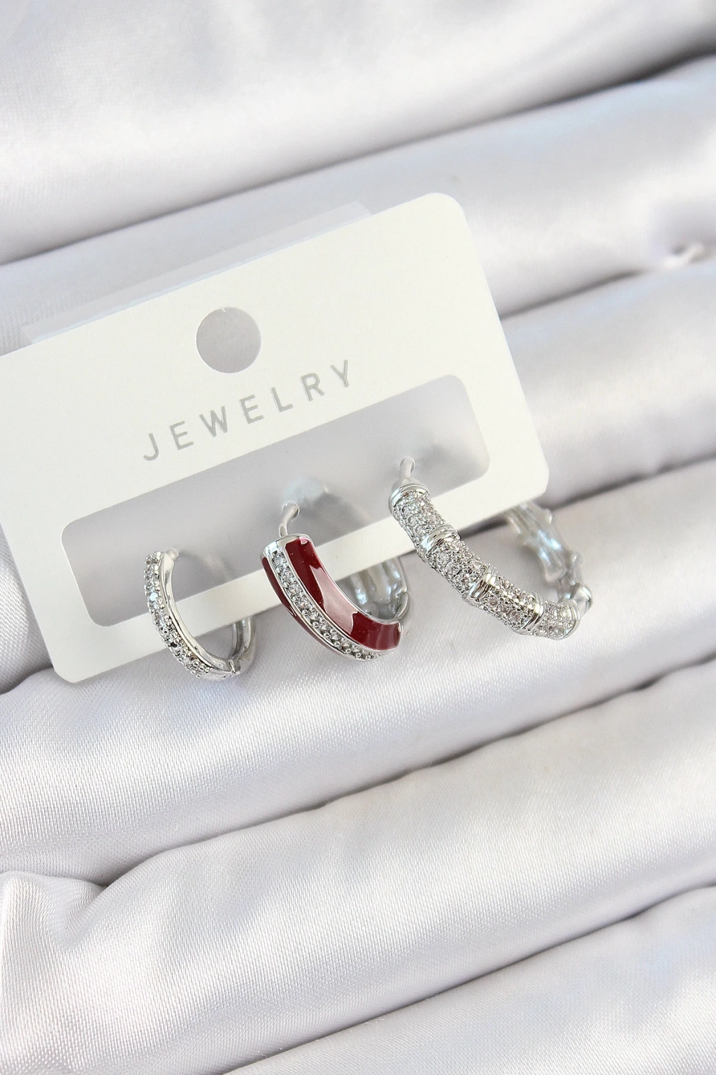 ® Pirinç Zirkon Taşlı Bordo Pembe Halka Model Gümüş Renk 3'lü Çift Kadın Küpe Set