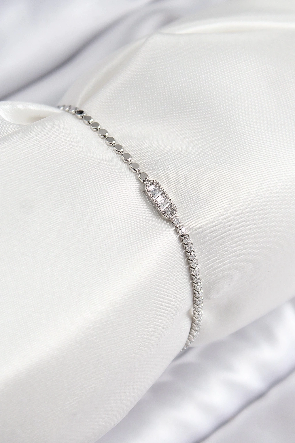 ® Pirinç Zirkon Taşlı Dikdörtgen Model Ezme Zincir Gümüş Renk Kadın Bileklik