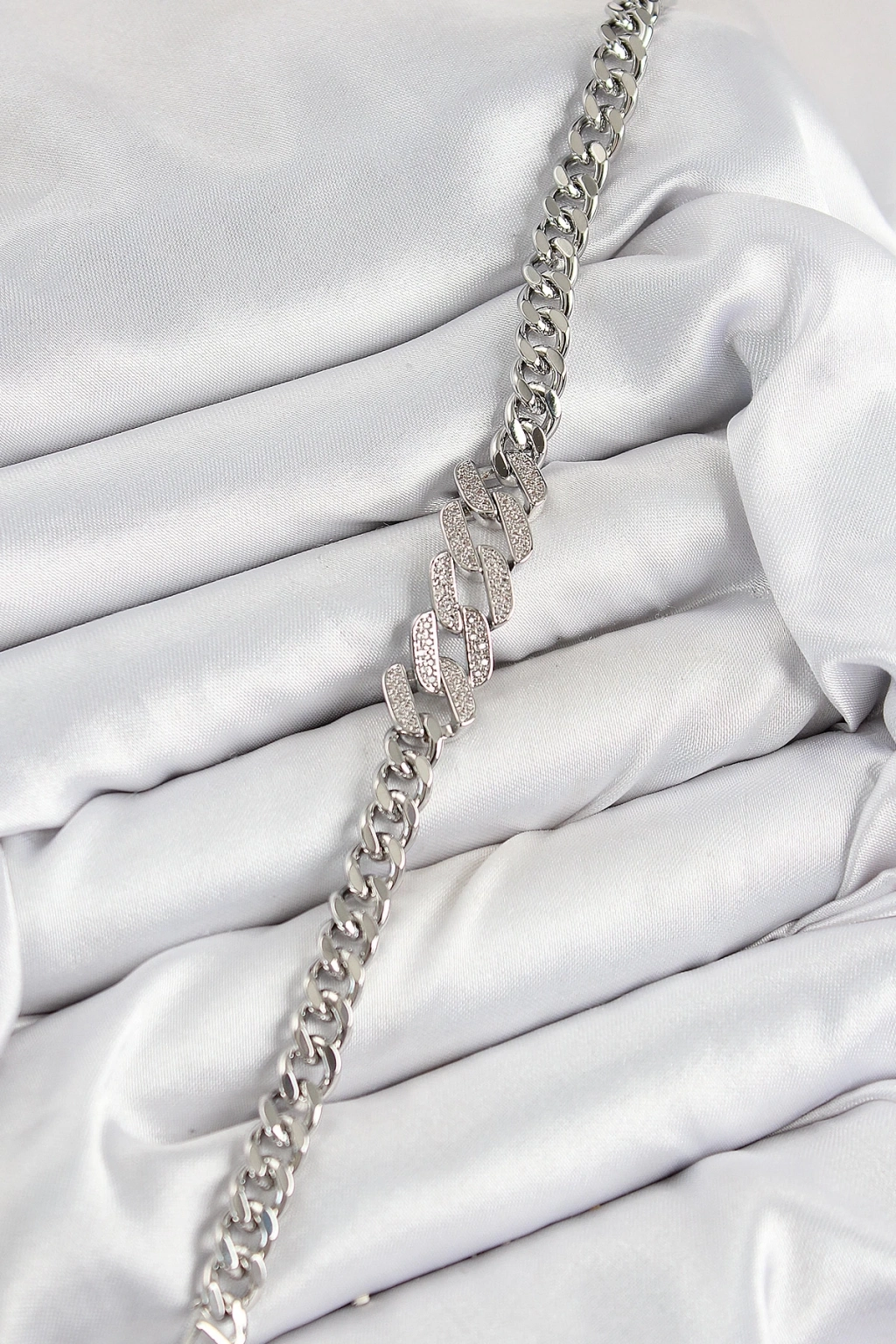 ® Pirinç Zirkon Taşlı Ezme Küba Zincir Model Gümüş Renk Kadın Bileklik
