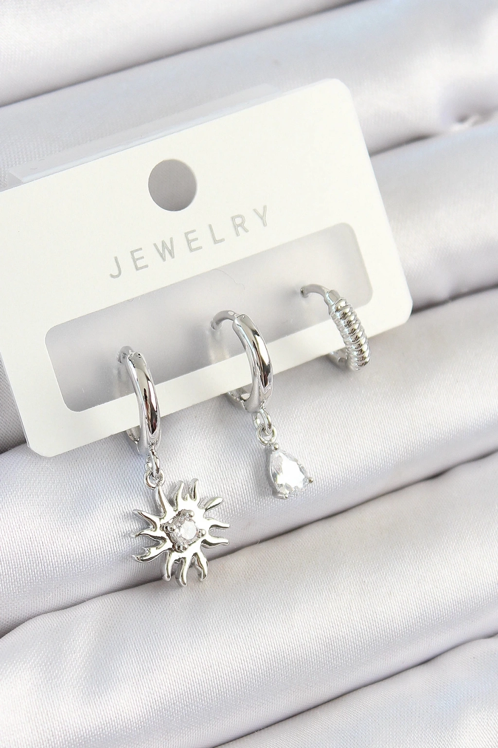 ® Pirinç Zirkon Taşlı Güneş Model Gümüş Renk 3'lü Çift Kadın Küpe Set