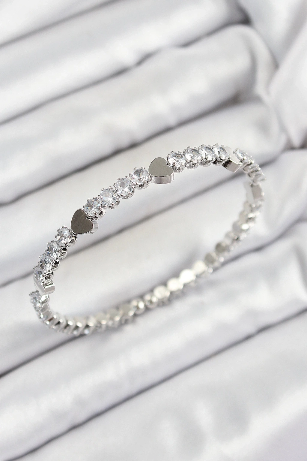 ® Pirinç Zirkon Taşlı Kalp Model Gümüş Renk Yaylı Kadın Bileklik