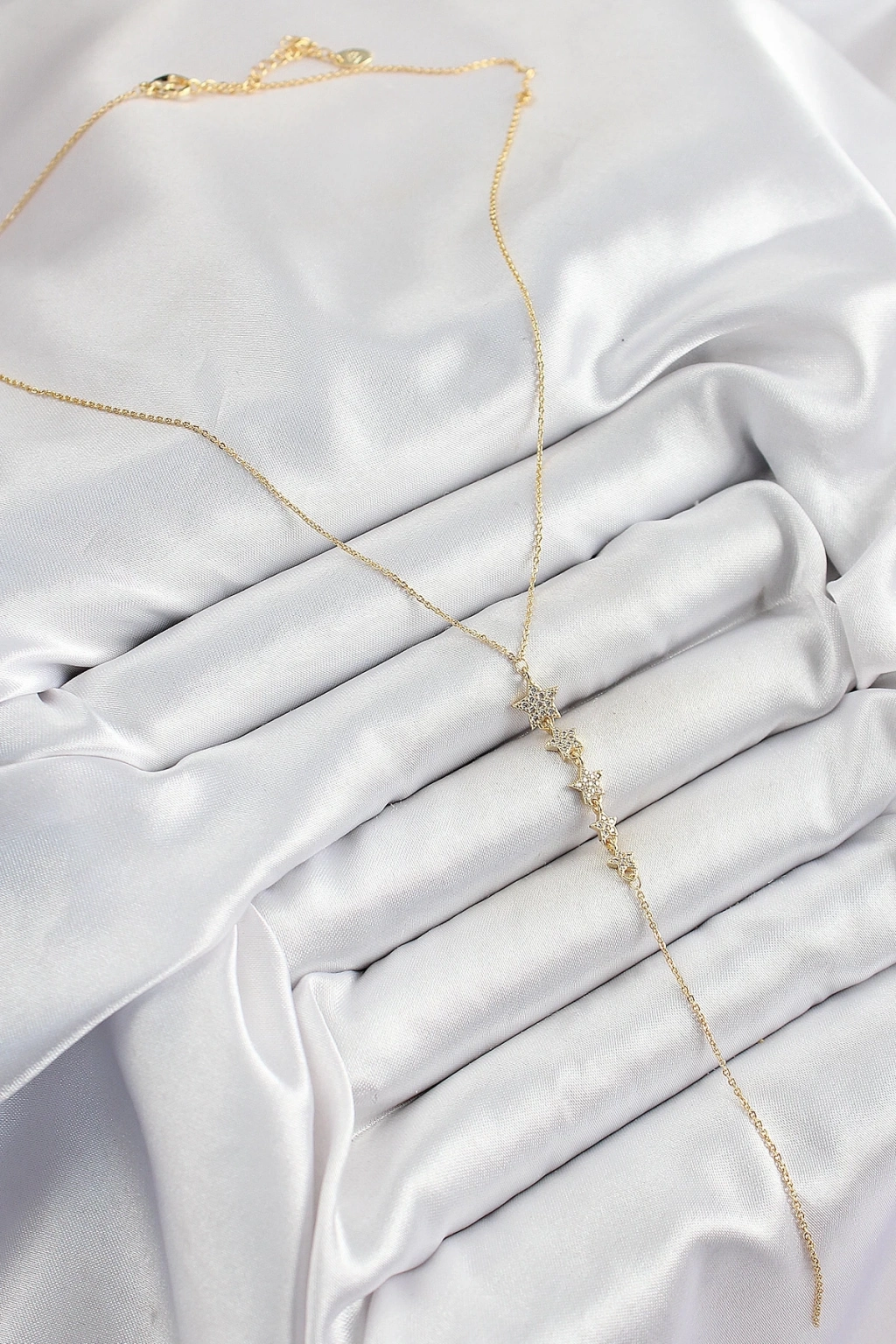 ® Pirinç Zirkon Taşlı Sıralı Yıldız Figürlü Y Model Gold Renk Kadın Kolye