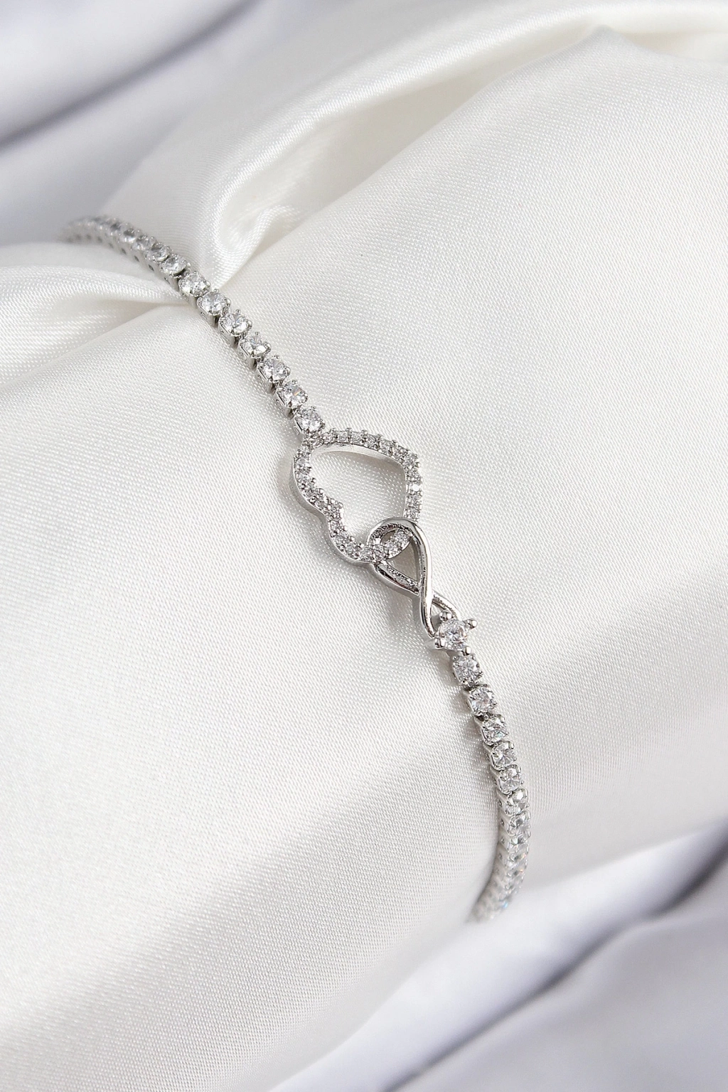 ® Pirinç Zirkon Taşlı Sonsuzluk Kalp Model Gümüş Renk Kadın Bileklik