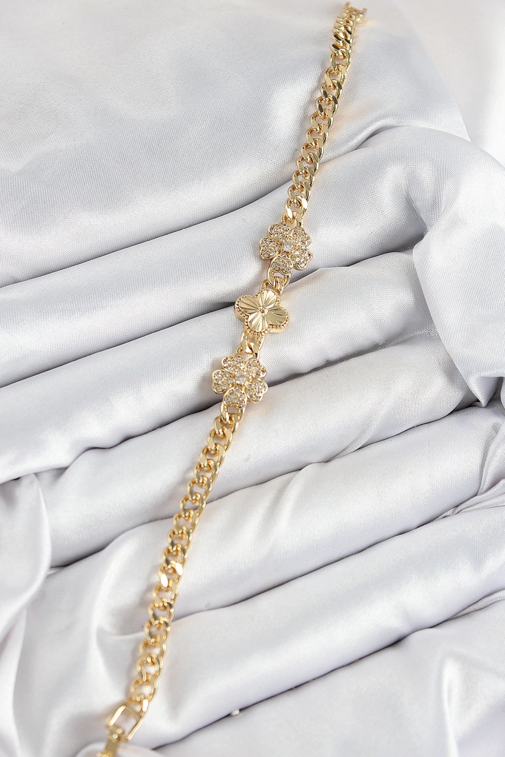 ® Pirinç Zirkon Taşlı Yonca Model Gold Renk Kadın Bileklik