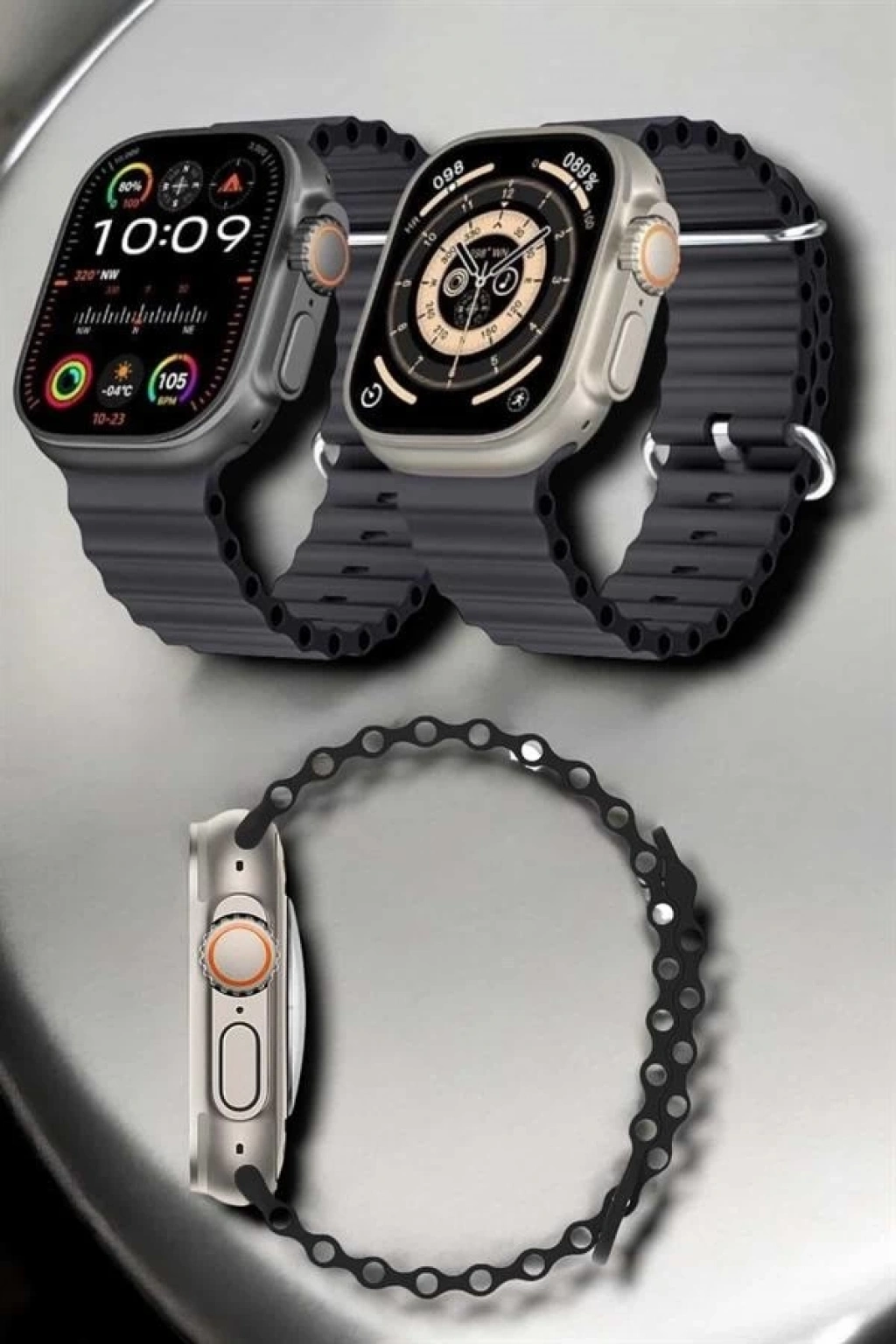 Bu ultra akıllı saat, geniş 49 MM ekranı ve gri kasa rengiyle hem şıklığı hem de fonksiyonelliği bir arada sunar.• Arama ve Bildirim Kontrolü: Telefonunuza gelen çağrıları cevaplayabilir, mesajlarınızı okuyabilir ve cevapsız çağrılarınızı kolayca kontrol edebilirsiniz.• Sağlık ve Uyku Takibi: Günlük adımsayar, kalp atış hızı takibi ve uyku düzeni analiziyle sağlıklı bir yaşam tarzı oluşturun.• Dayanıklı Yapı: IPX sertifikası ile suya ve toza karşı koruma sunar; açık hava sporlarında güvenle kullanabilirsiniz.• Uzun Pil Ömrü: 300-400 mAh güçlü bataryasıyla kesintisiz bir kullanıcı deneyimi sunar.• Kişiselleştirilmiş Konfor: Çift kordon seçeneği ile tarzınıza uygun kullanım imkanı sağlar.Tüm bu özellikleri ve şık tasarımıyla, bu saat gündelik hayatınızın vazgeçilmez bir parçası olacak!