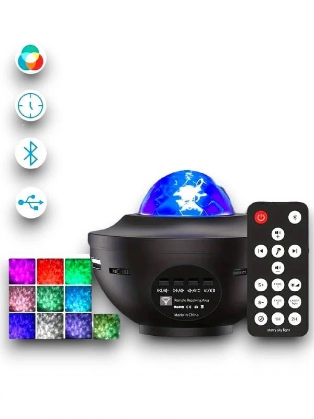 • * 10 renk dinamik projeksiyonlar: beş standart renk, kırmızı su dalgası, mavisu dalgası, yeşil su dalgası, beyaz su dalgası ve yeşil lazer noktası, her ikirenk karıştırılabilir ve her iki su dalgası rengi de yeşil lazer noktası ilekarıştırılabilir, Böylece en fazla 10 renk alabilirsiniz. Size muhteşem biryıldızlı ışık göstermek için, farklı hızların dinamik gece projeksiyonu ilekombine çeşitli renkler, rahat, romantik, renkli bir uzay projeksiyon ortamıyaratmak.* Uzaktan kumanda ve müzikal: uzaktan kumanda