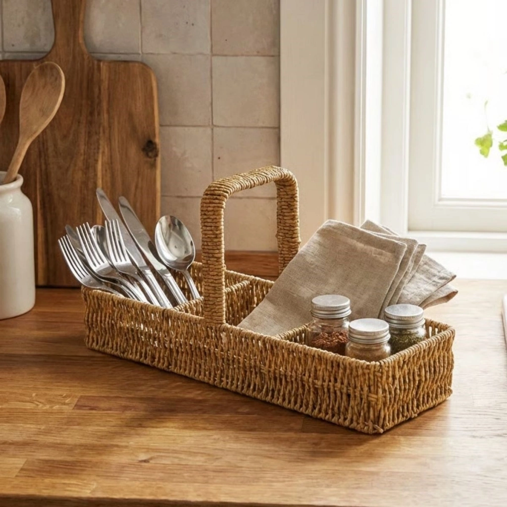 ® 3 Bölmeli Plastik Rattan Düzenleyici–Saplı Masaüstü Organizer, Mutfak Kaşık Çatal Sepeti, Banyo & Ofis Çok Amaçlı Sunum Standı