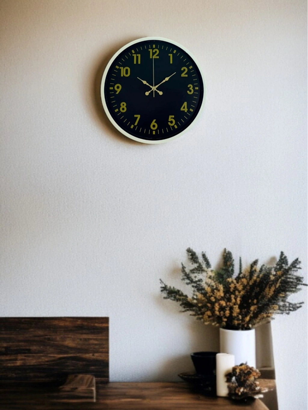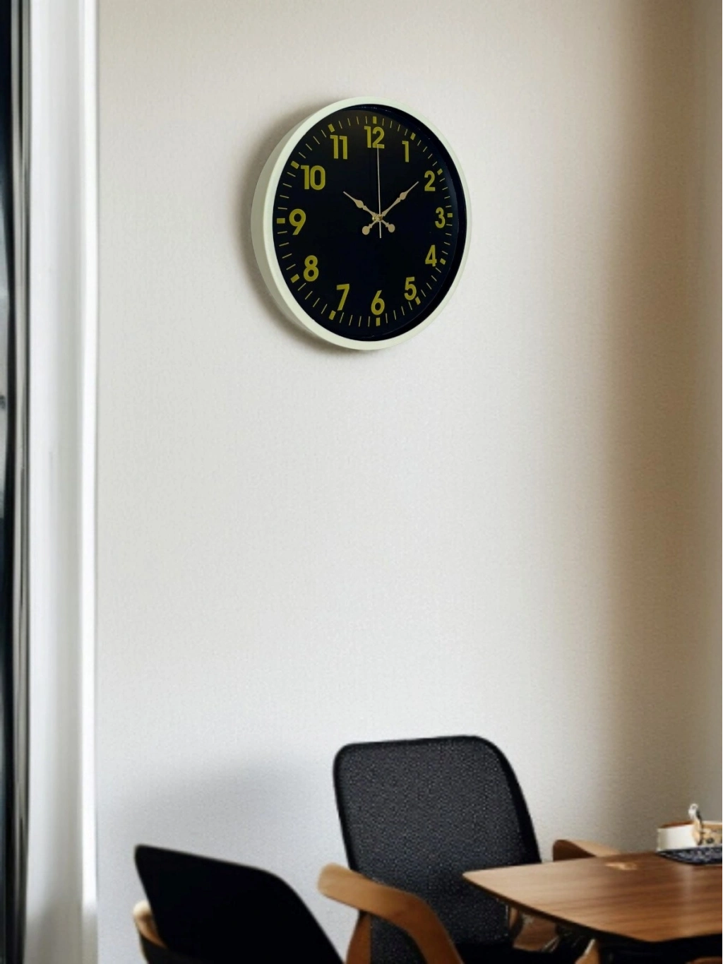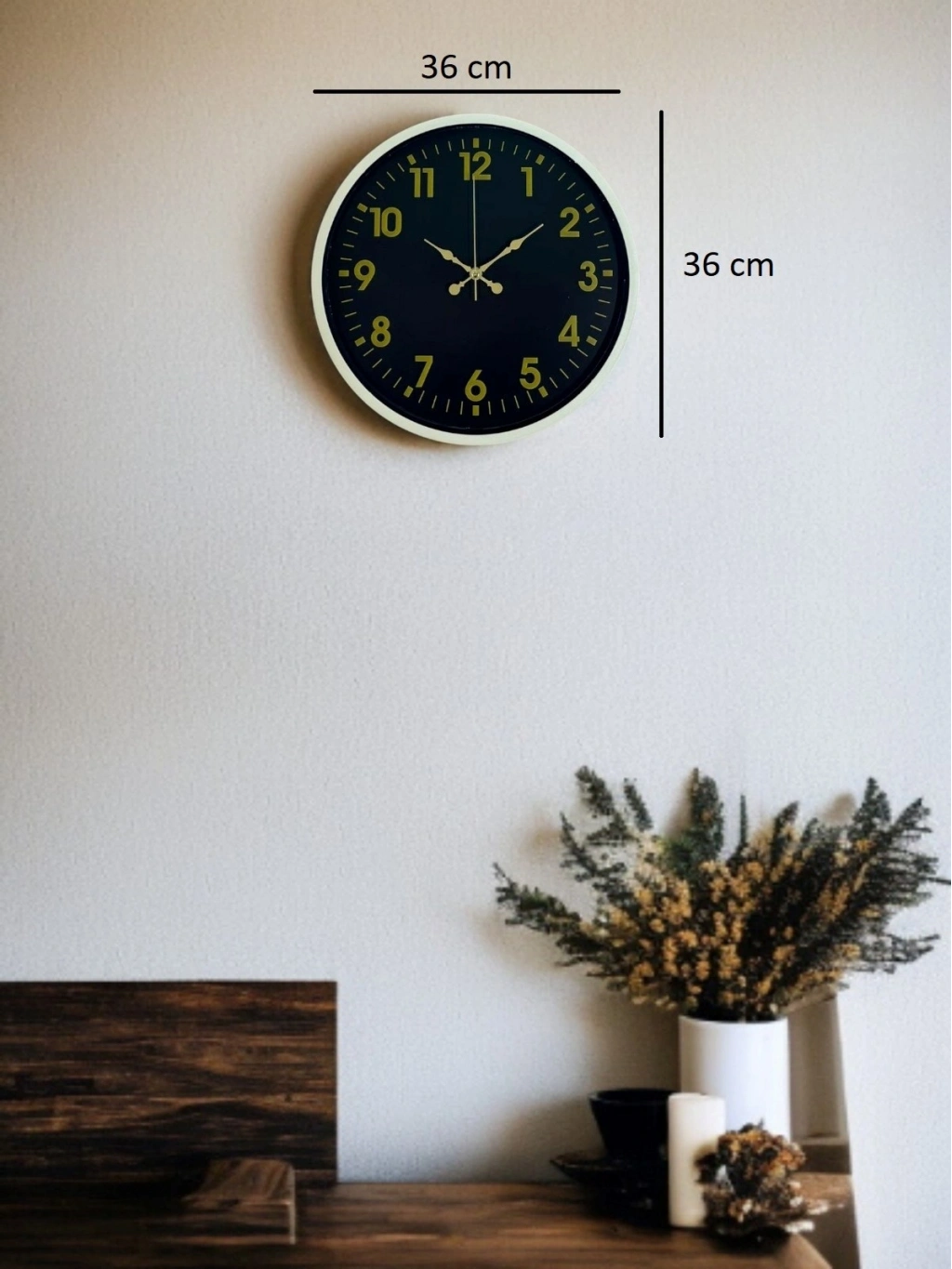 Krem renkli çerçevesi ile koyu zemin üzerindeki gold tonlu rakamları ve zarif akrep-yelkovan tasarımı sayesinde bu 36 cm duvar saati, bulunduğu ortama klasik ve sofistike bir hava katar. Net ve dengeli kadran yapısı, saatin her açıdan rahatlıkla okunmasını sağlar. Hem modern hem de klasik dekorasyon stilleriyle uyumlu, zamansız bir tasarıma sahiptir.