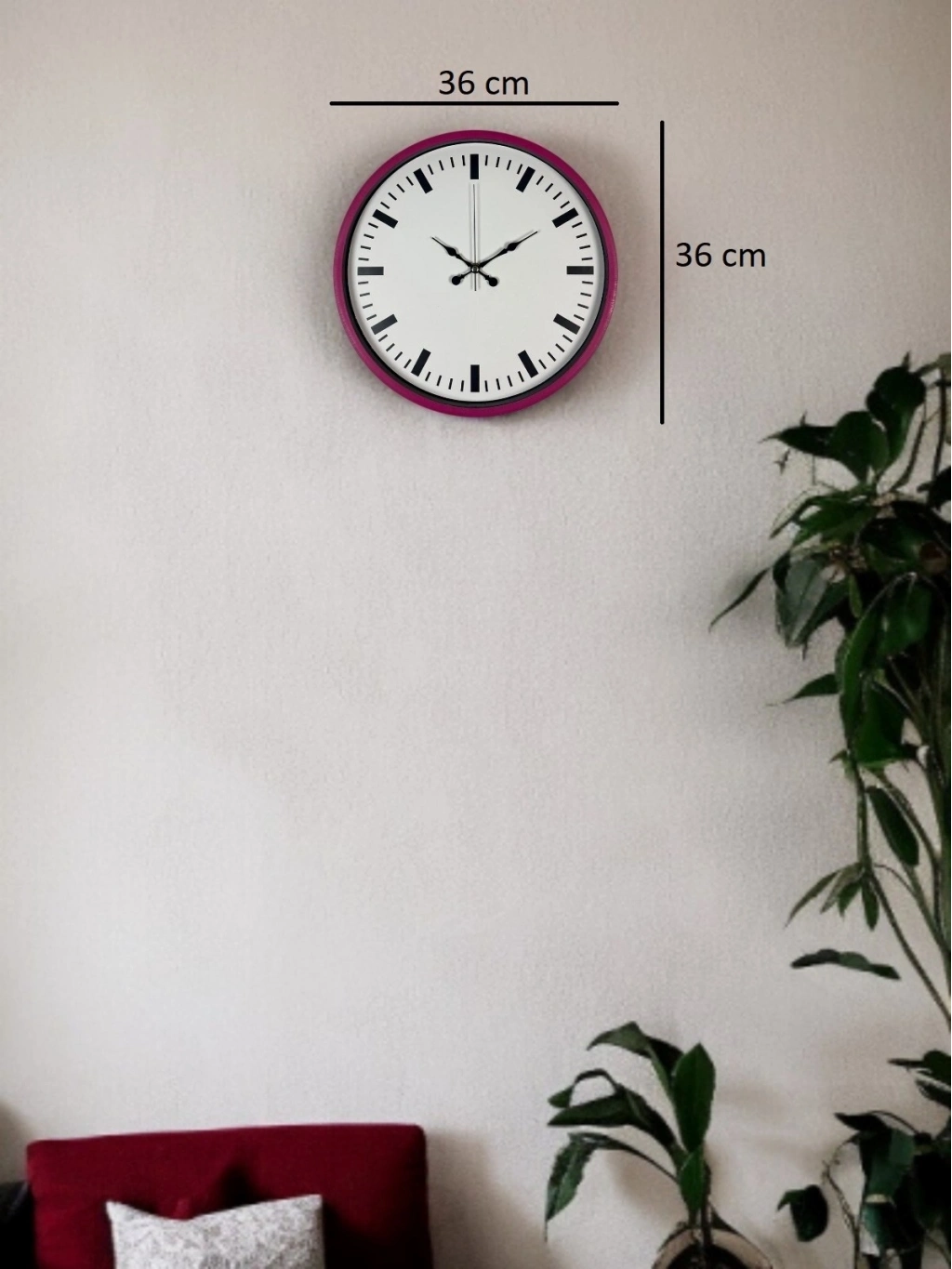 Canlı pembe çerçevesi ve sade beyaz kadran tasarımıyla öne çıkan bu 36 cm duvar saati, yaşam alanlarına enerjik ve modern bir dokunuş kazandırır. Minimal indeks yapısı sayesinde saati uzaktan dahi kolayca okumak mümkündür.