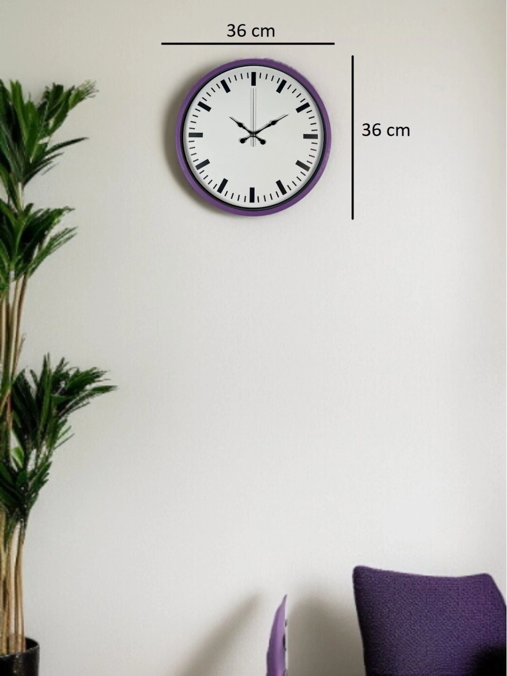Şık mor çerçevesi ve sade beyaz kadranıyla tasarlanan bu 36 cm duvar saati, yaşam alanlarına modern ve farklı bir dokunuş kazandırır. Minimal indeks tasarımı ve net kontrastı sayesinde saati uzaktan dahi kolayca okumak mümkündür.