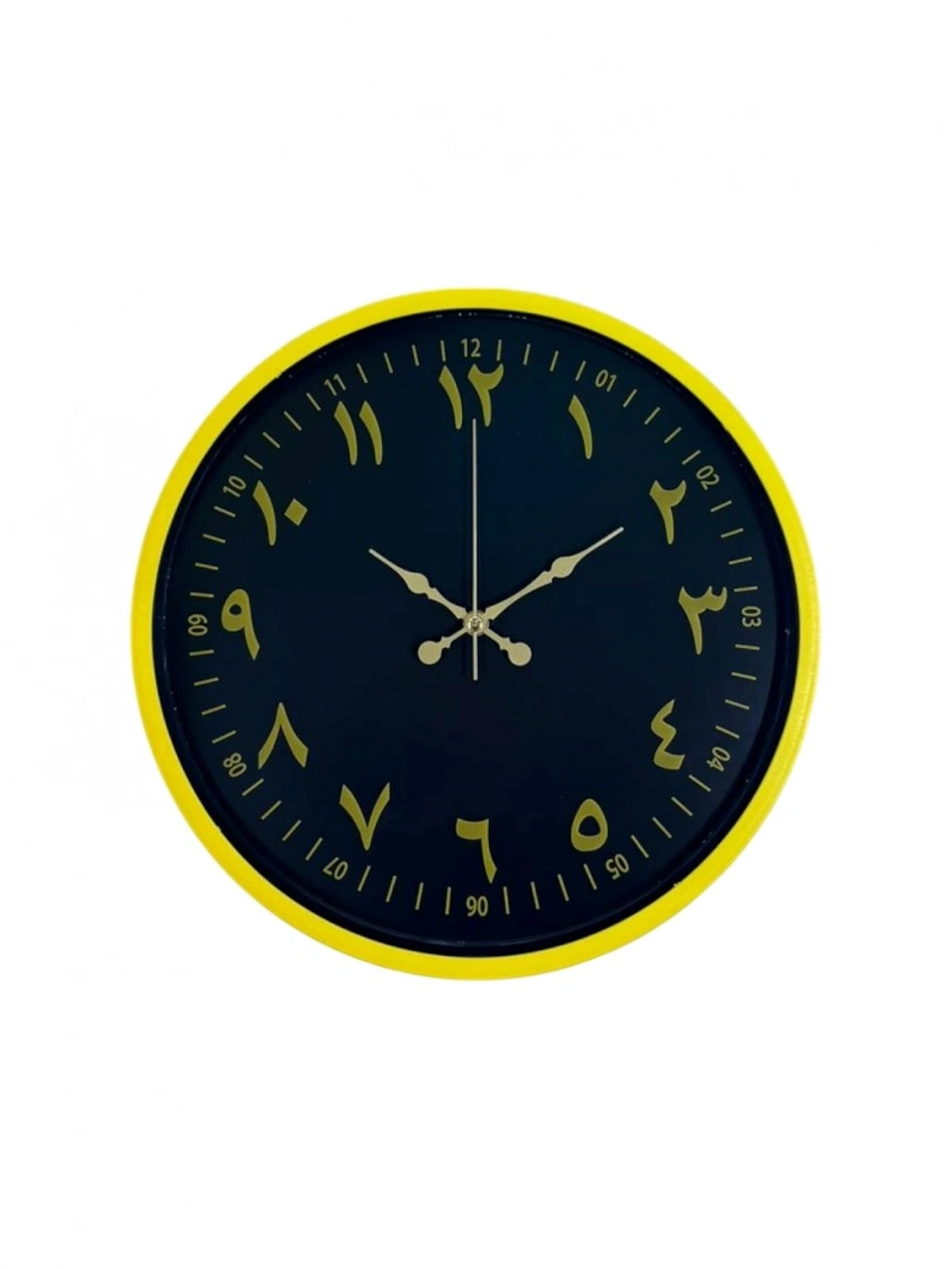 Canlı sarı çerçevesi ve koyu renk kadranı üzerinde yer alan Arapça rakamları ile tasarlanan bu 36 cm duvar saati, klasik estetiği modern bir çizgiyle buluşturur. Altın tonlu rakamlar ve akrep-yelkovanlar, yüksek kontrast sayesinde saati uzaktan dahi net biçimde okunur kılar.