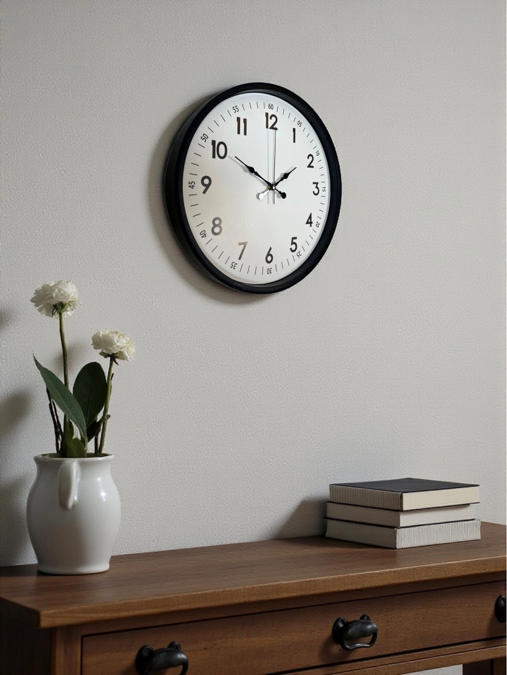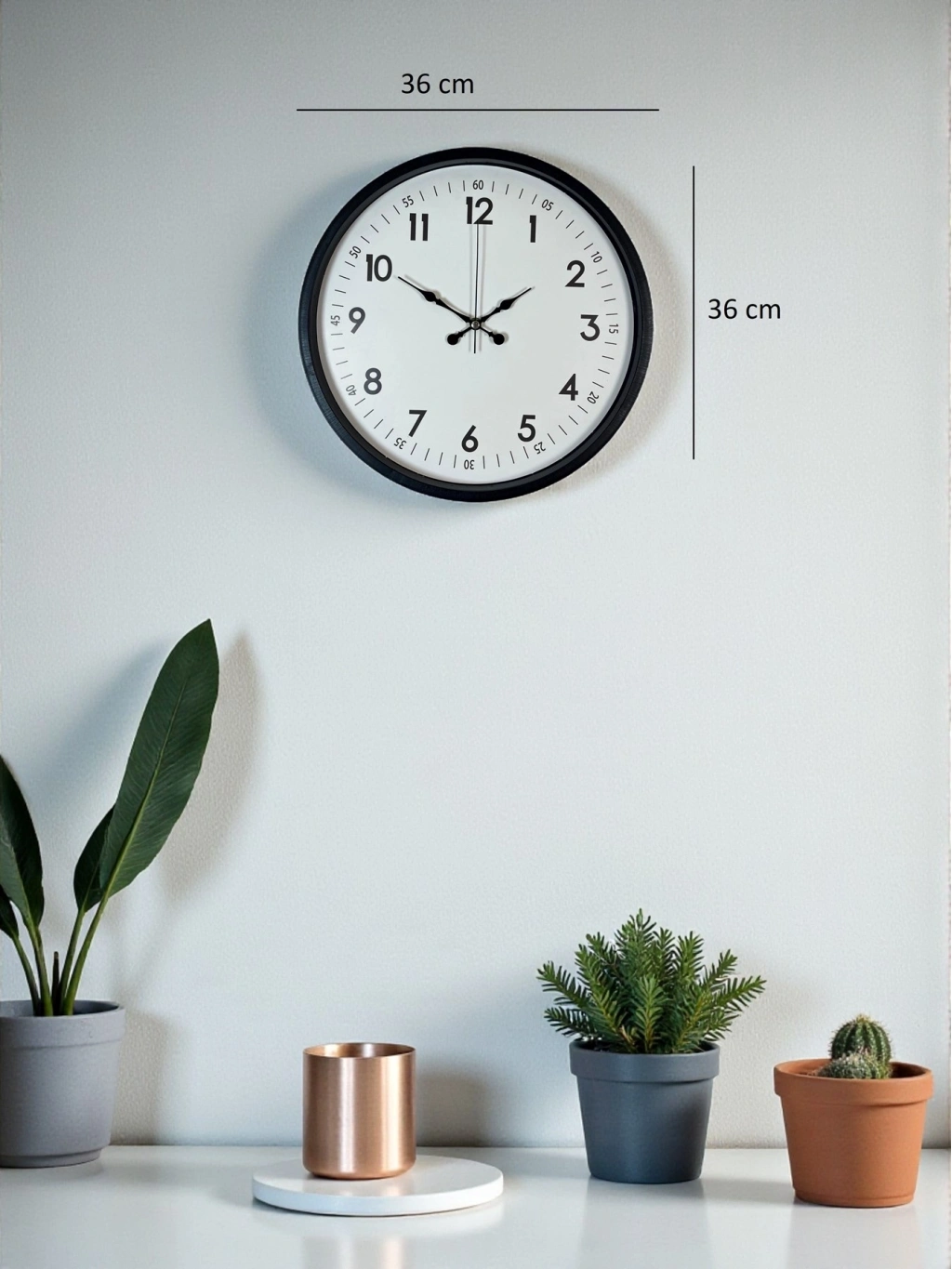 Modern ve sade tasarımıyla her dekorasyon tarzına uyum sağlayan bu 36 cm siyah duvar saati, hem estetik hem de fonksiyonel kullanım arayanlar için mükemmel bir seçimdir.; Mat siyah çerçevesi, beyaz zeminli geniş kadranı ve büyük okunaklı rakamları ile saati uzaktan bile kolayca görebilmenizi sağlar.; Kadrandaki ekstra dakika göstergeleri (05, 10, 15..; ) özellikle ofis, okul, çalışma ortamı ve hassas zaman takibi isteyen alanlar için büyük avantaj sağlar.; Saatin ön yüzünde kullanılan gerçek cam, plastik camlara göre çok daha dayanıklı olup uzun yıllar boyunca net ve parlak görünümünü korur.; Gerçek cam; sararma yapmaz, ışığı doğru kırar, çizilmeye karşı yüksek direnç sunar ve ürüne premium bir kalite hissi kazandırır.; Temizlendiğinde ilk günkü kadar berrak görünmesi, kullanıcıların en çok beğendiği özelliklerdendir.; Sessiz çalışan akar saniye (sweep) mekanizması, tıkırtı sesi çıkarmadan akıcı bir hareket sunar.; Bu sayede saat; yatak odası, çalışma odası, ofis, kütüphane ve sessizlik gerektiren tüm mekanlar için kusursuz bir kullanım sağlar.; Rahatsız edici hiçbir ses çıkarmaz, gün boyu ve gece boyunca konforlu bir sunar.; Dayanıklı plastik gövdesi hafif olup duvara kolayca monte edilebilir.; Siyah çerçevesinin modern ve şık görünümü; ev, ofis, çalışma alanı, mağaza, kafe, salon veya endüstriyel tarz dekorasyonlarda güçlü bir tamamlayıcıdır